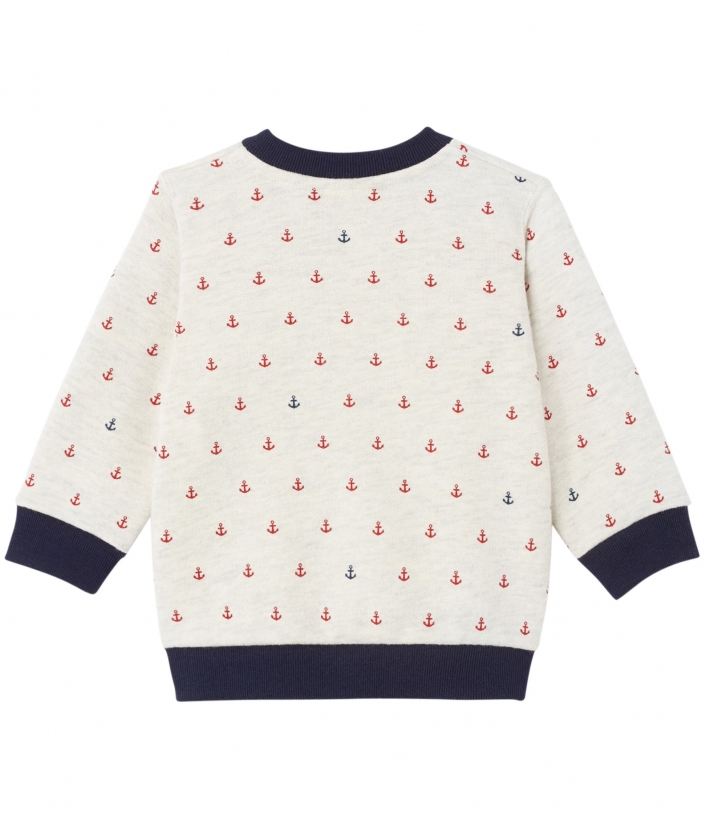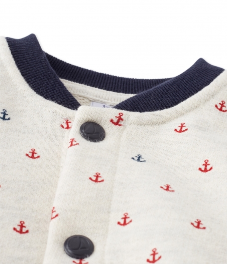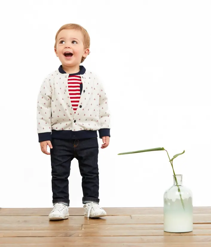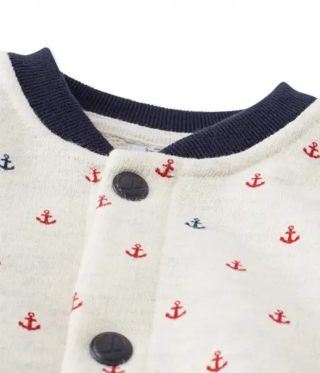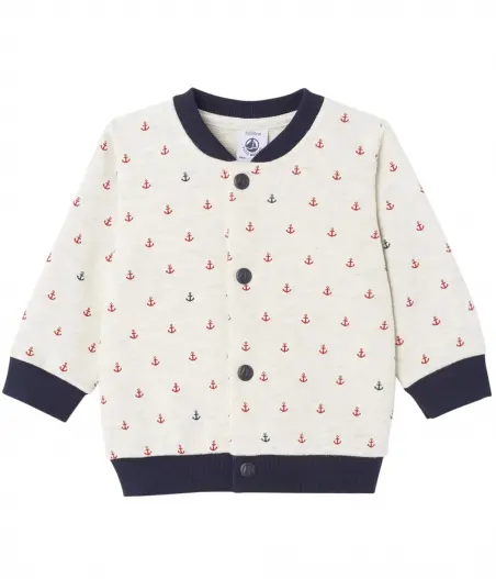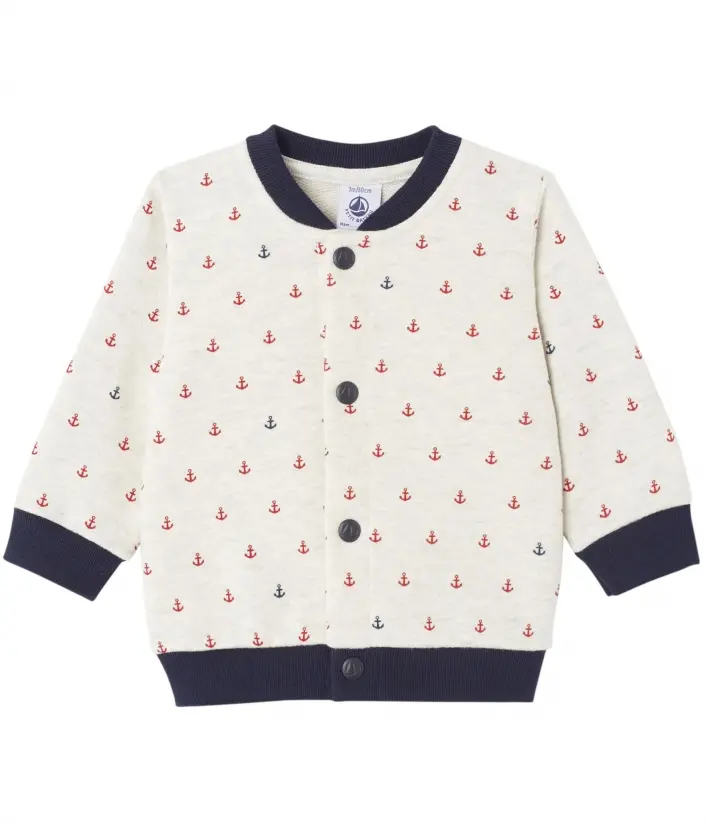 Теплый кардиган с круглым вырезом и застежкой на кнопках для мальчика. Изготовлен из мягкой хлопчатобумажной ткани с элегантным принтом. Состав: 100% хлопок.