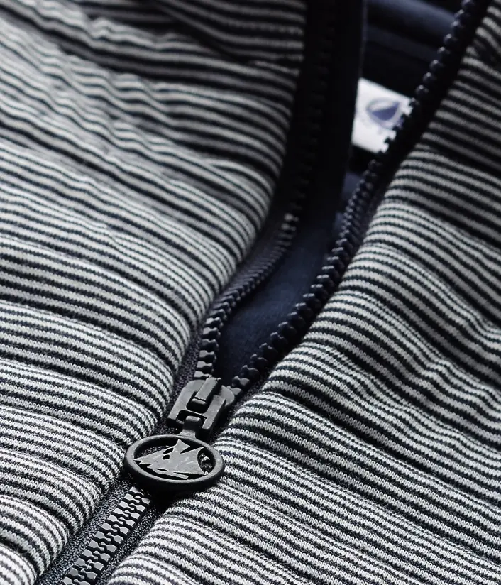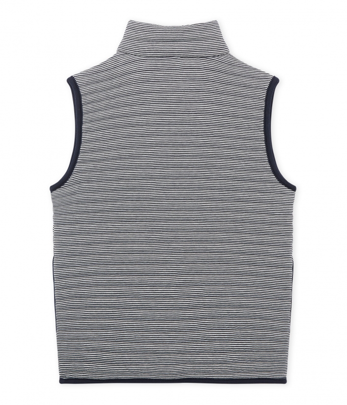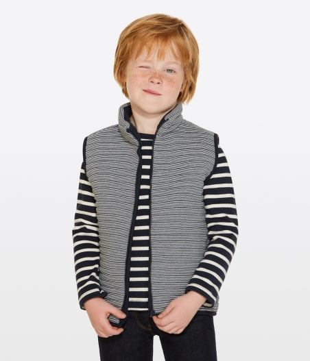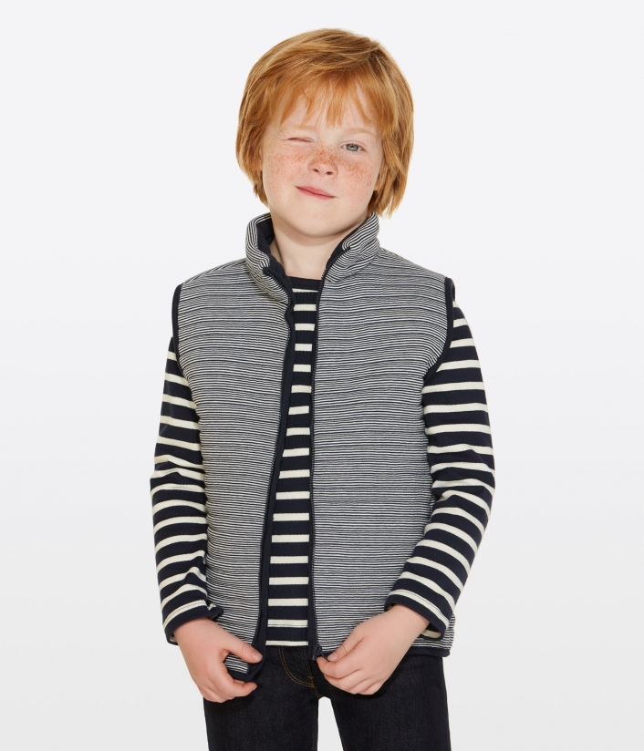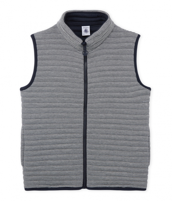 Жилетка без рукавов для мальчиков, изготовленная из стеганой ткани и двойной вязанной ткани в полоску. Мягкая и теплая жилетка идеально подойдет для ношения под куртки и пальто из коллекции от Petit Bateau. Эта жилетка станет неотъемлемой частью гардероба для прохладной погоды. Материал: 60% хлопок, 40% полиэстер