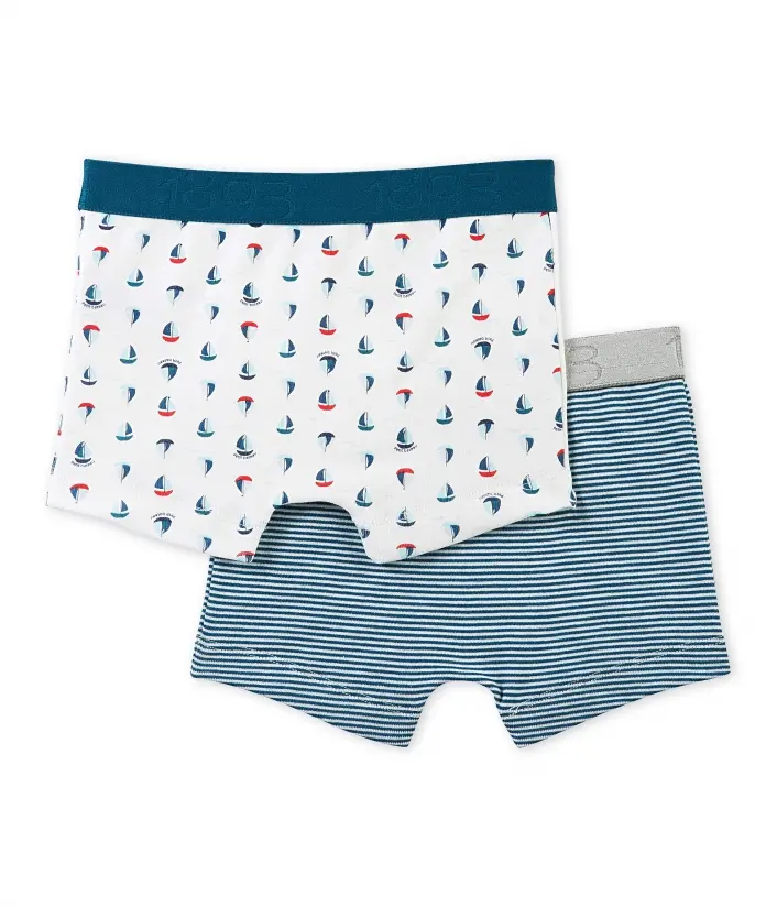 Набор из двух боксеров для мальчика: одни боксеры изготовлены из ткани в мелкую полоску, другие - с изображением корабликов. Обратите внимание на удобный эластичный пояс. Материал: 100% хлопок.