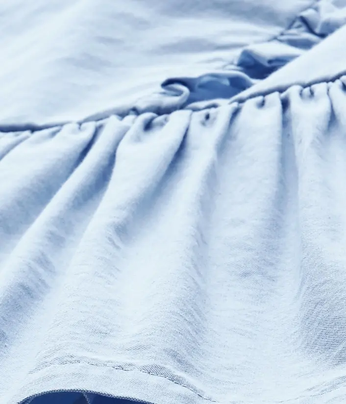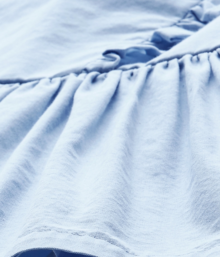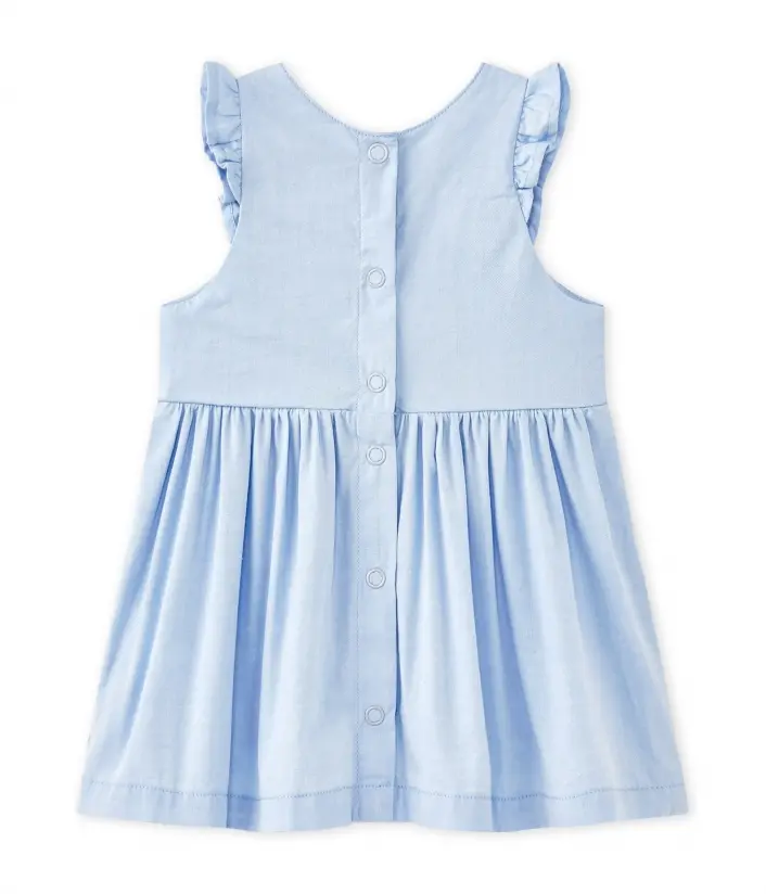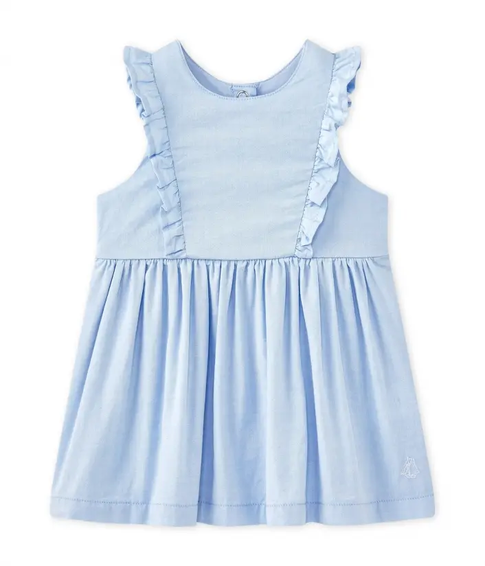 Однотонное летнее платье из 100% хлопка с рюшами по бокам. Низ платья украшен вышивкой традиционного парусника Petit Bateau. Морская тематика присуща изделиям Petit Bateau, что делает его таким особенным.