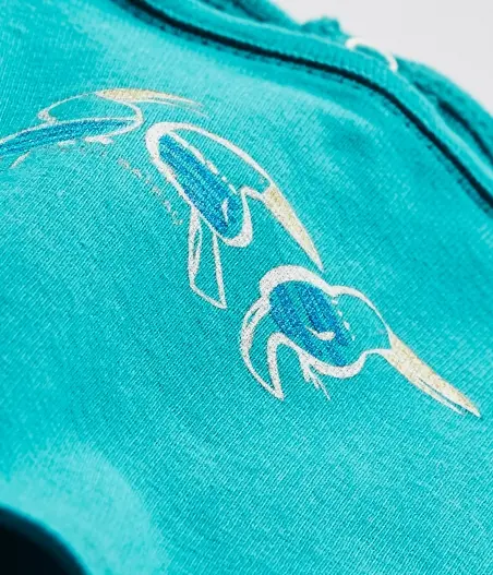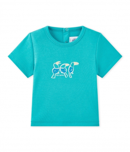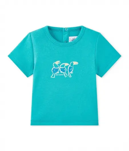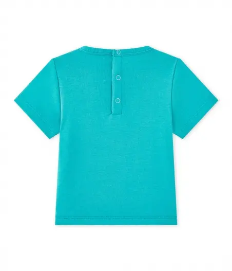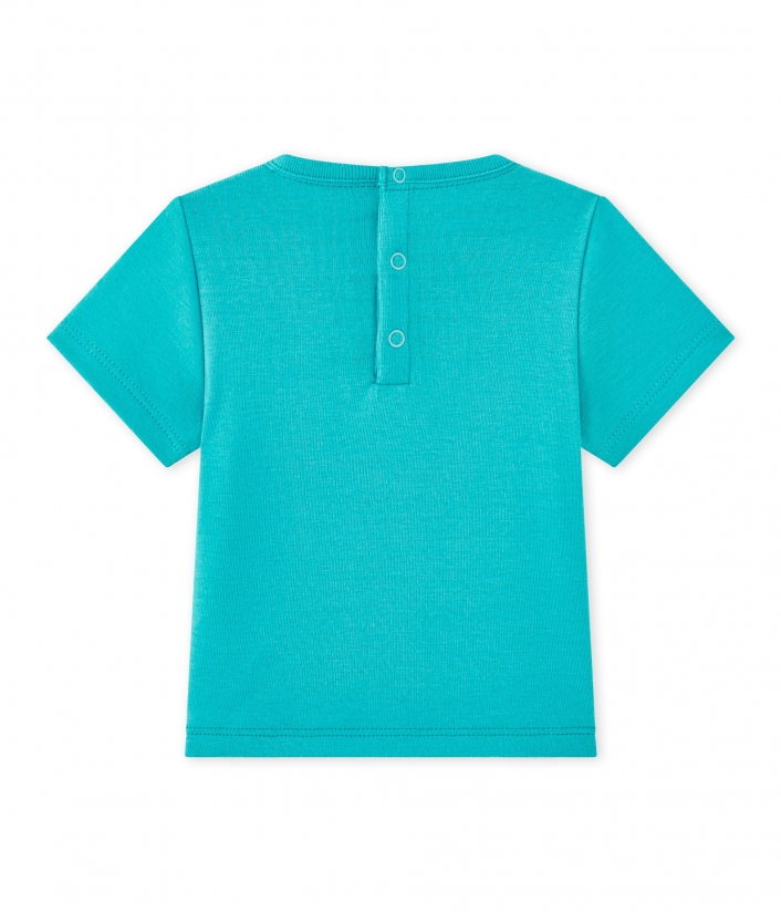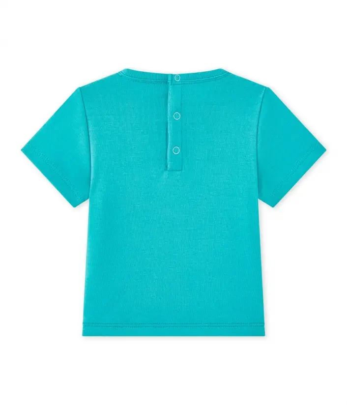 Хлопчатобумажная футболка имеет застежку на кнопки для удобного одевания. Состав: 100% хлопок.