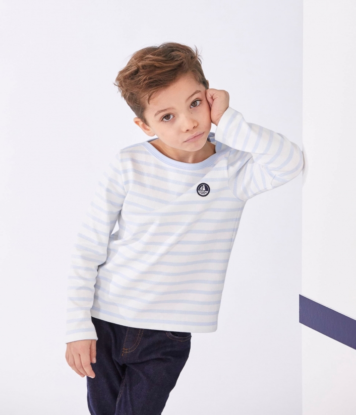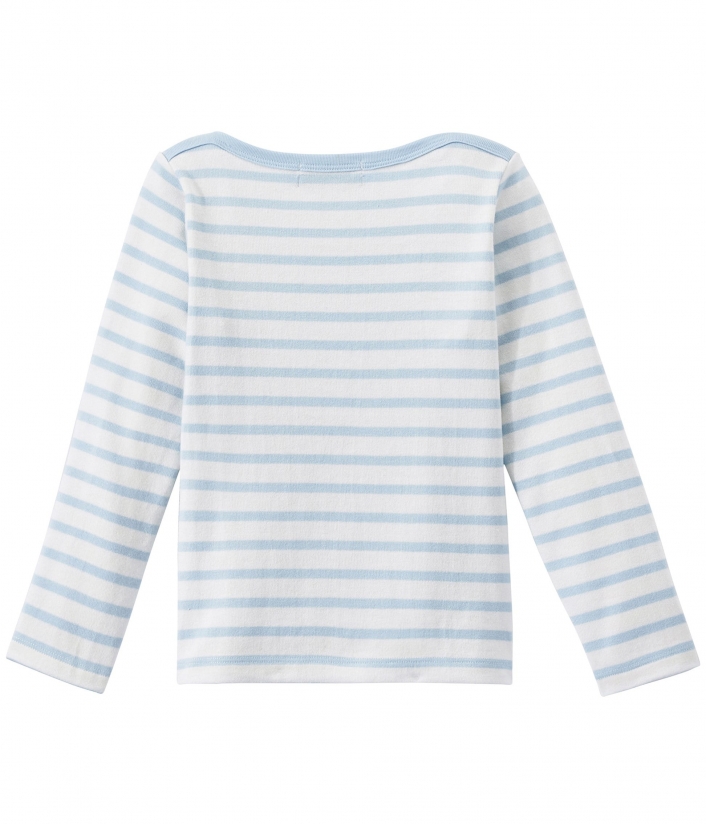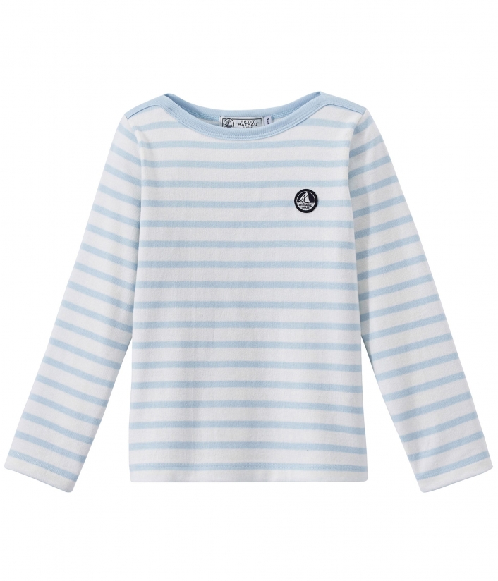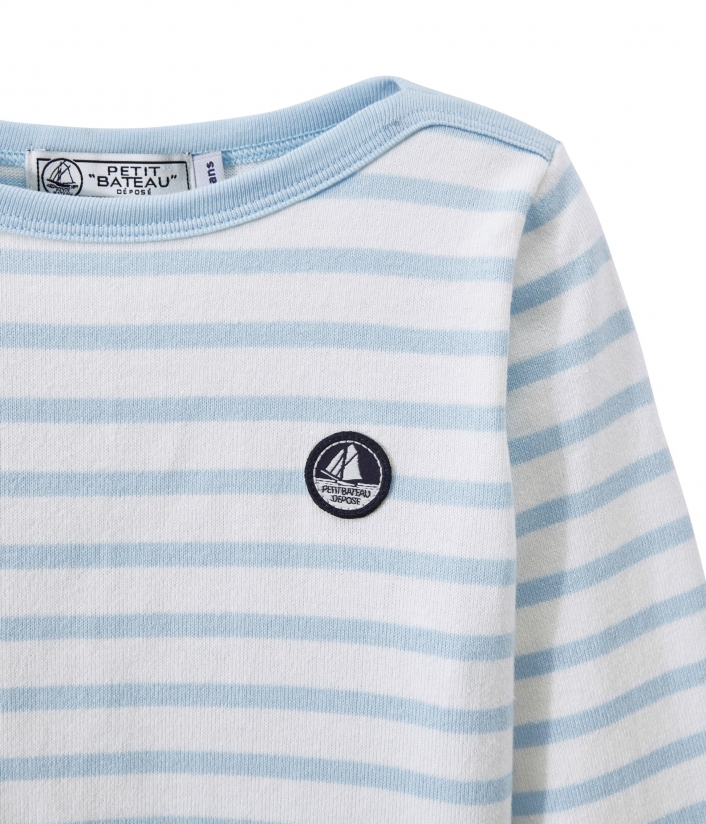 Свитер украшен традиционными морскими полосками от Petit Bateau и декорирован фирменным логотипом в виде маленького парусника. Состав: 100% хлопок.