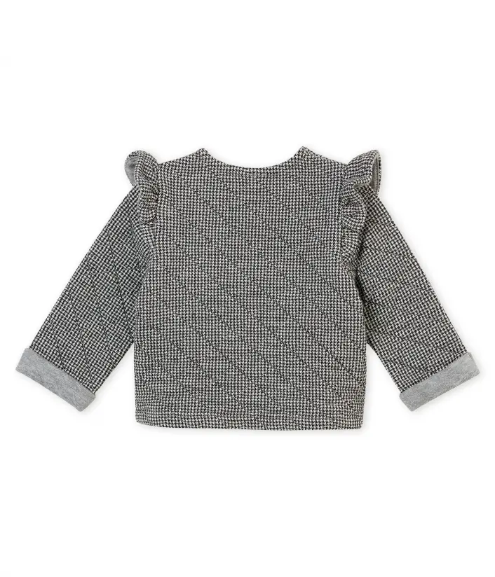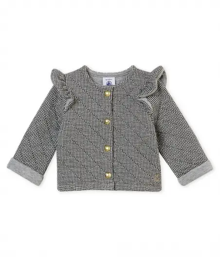 Кардиган имеет прямой силуэт с центральной застежкой на золотистые пуговицы Petit Bateau, с круглым вырезом горловины. Стильное трикотажное изделие с рюшами по бокам и вышивкой золотистого парусника Petit Bateau спереди. Состав: 88% хлопок, 12% полиэстер