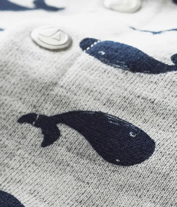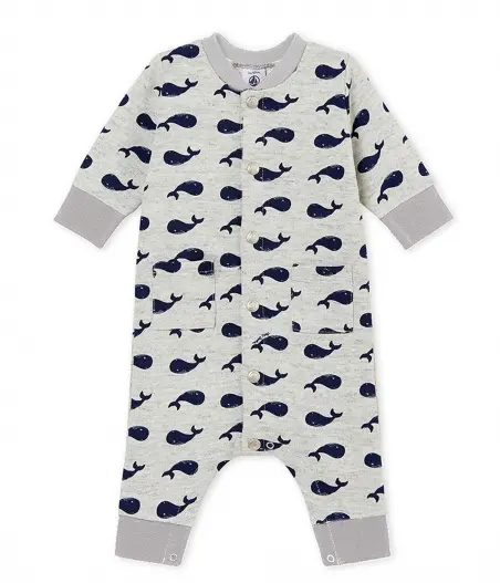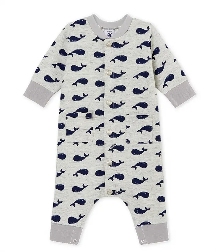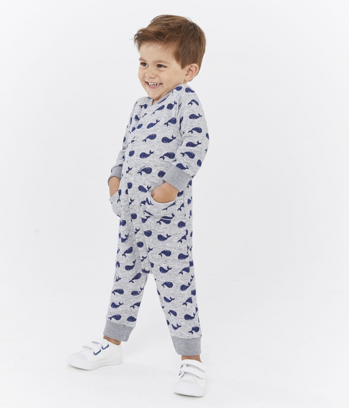 Трикотажный комбинезон украшен принтом китов. Он декорирован милыми накладными карманами. Комбинезон для малышей предусматривает частую смену памперсов, поэтому он имеет удобные застежки на кнопки в шаговом шве. Практичная одежда на каждый день. Состав: 100% хлопок / 97% хлопок, 3% эластан