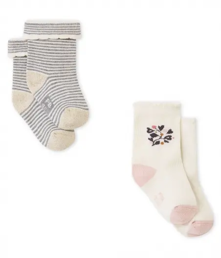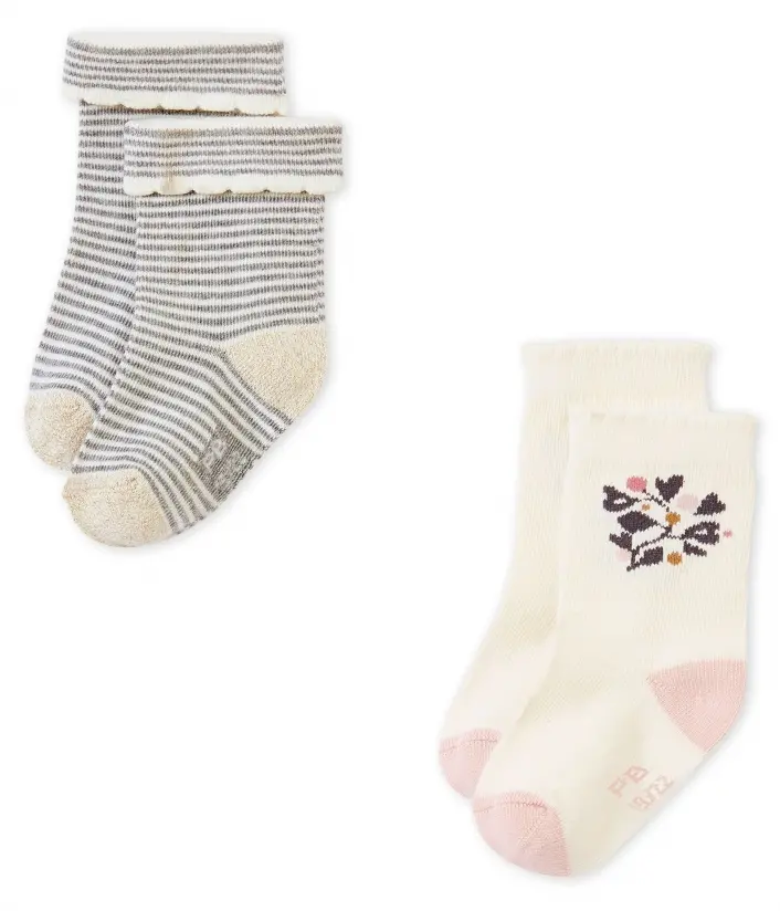Две пары милых носков для детей, которые прекрасно завершат образ. Они сшиты из джерси: одни с полосками и манжетой, вторые - с узором на голени. Традиционно на стопе отпечаток инициалов Petit Bateau с определенным размером. Длина стопы: 15/18 = 7,4-8,3 см; 19/22 = 9,7- 10,6 см; 23/26 = 18,8-14,6 см. Состав: 85% хлопок, 12% полиамид, 2% эластан, 1% полиэстер / 87% хлопок, 11% полиамид, 2% эластан