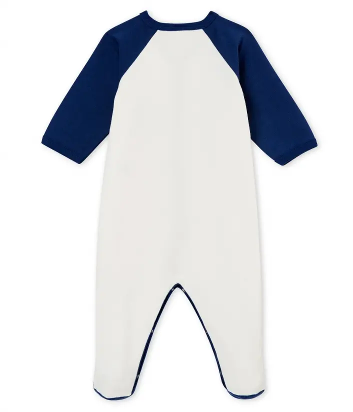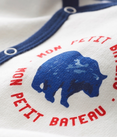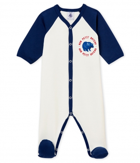 Пижама с контрастными рукавами, стопами и окантовкой. Она украшена интересным принтом медвежонка. Застежки на кнопочки для удобного переодевания. OEKO-TEX® гарантирует безопасность для кожи. Состав: 100% уникальный хлопок