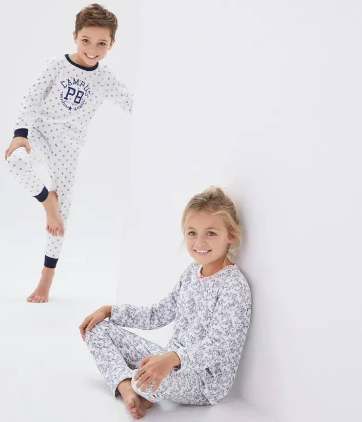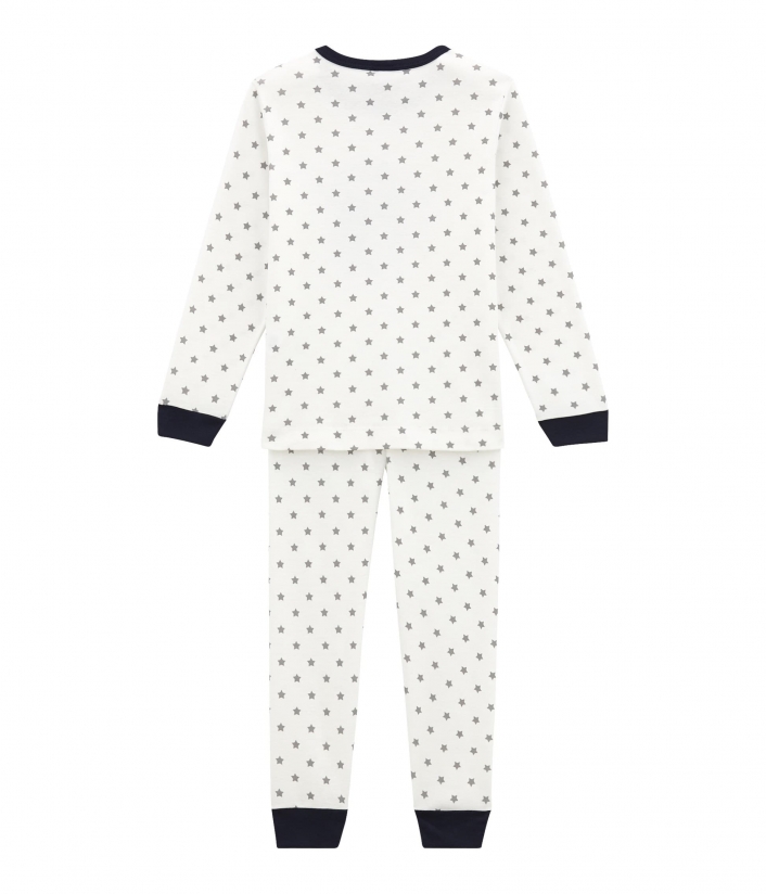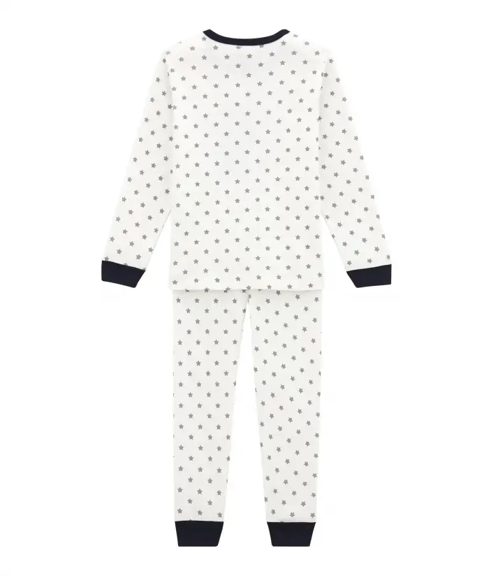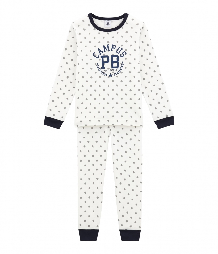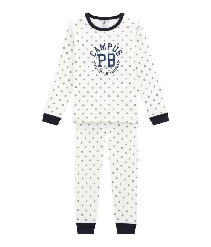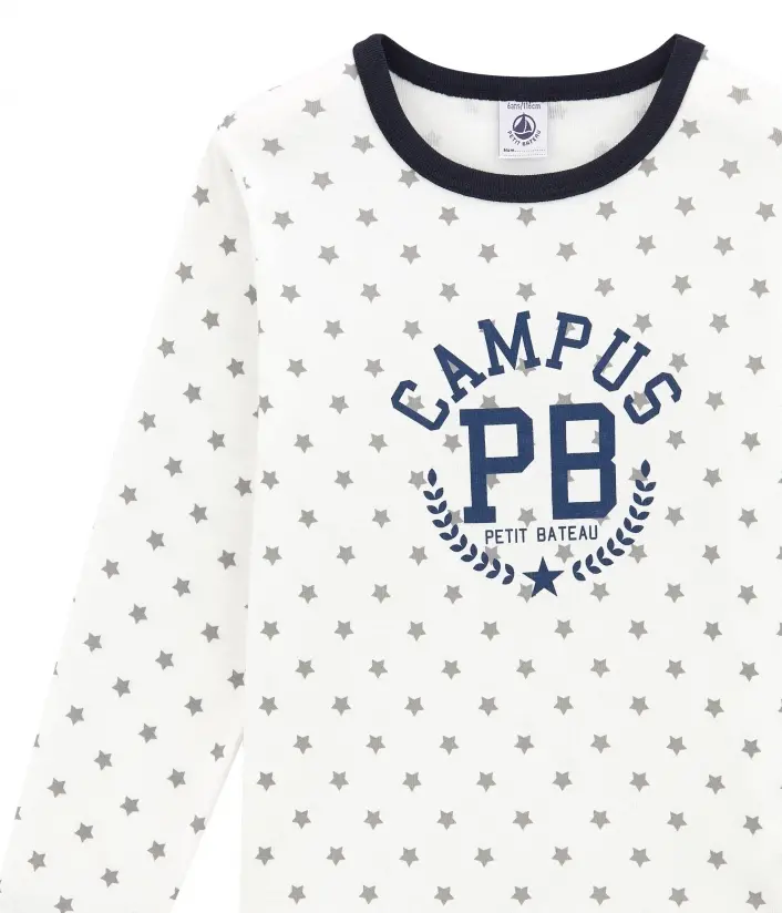Однотонная теплая пижама молочного цвета в стиле "колледж" с принтом на футболке и звездочками. Контрастная горловина придает особый шарм пижаме. Рукава футболки и брюки с манжетами темно-синего цвета. Отличный выбор для комфортного сна. OEKO-TEX® гарантирует безопасность для кожи. Состав: 100% уникальный хлопок