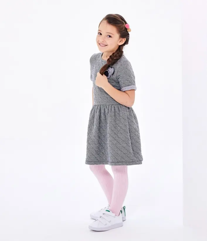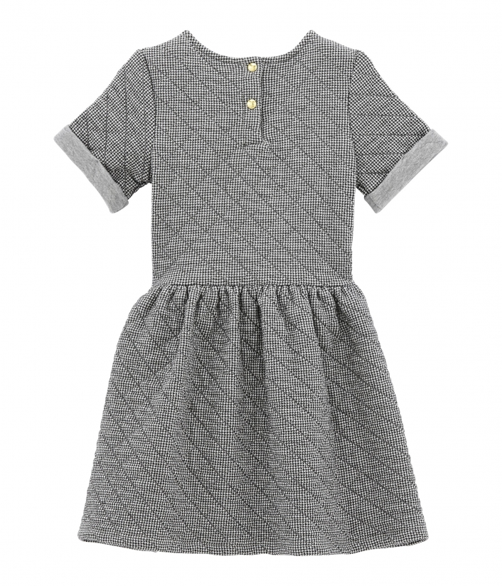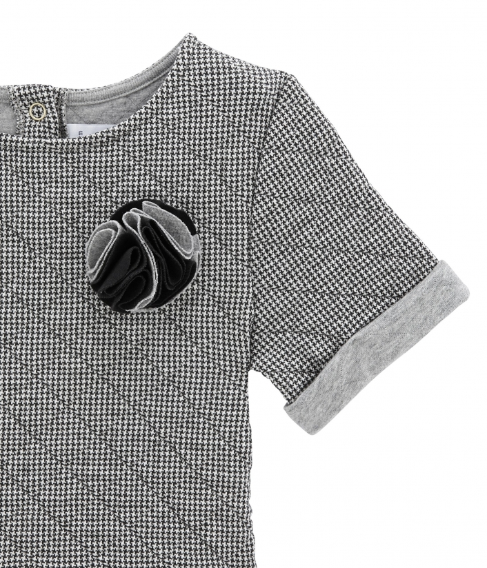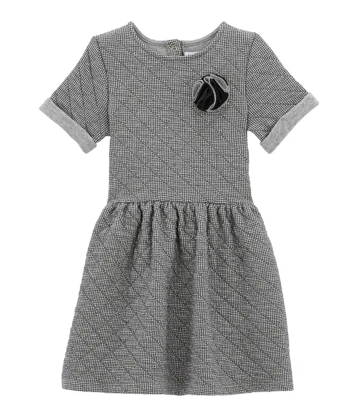 Платье с короткими рукавами для девочки. Изготовлено ​​из двойного стеганого хлопка и украшено розой на груди. Пышная юбка в складочки придает платью особый шарм. Застежки на кнопочки сзади облегчат переодевания. Отличный выбор для школы. Состав: 88% хлопок, 12% полиэстер