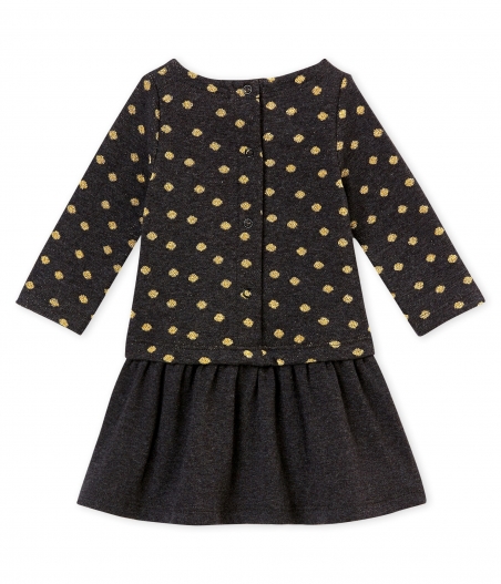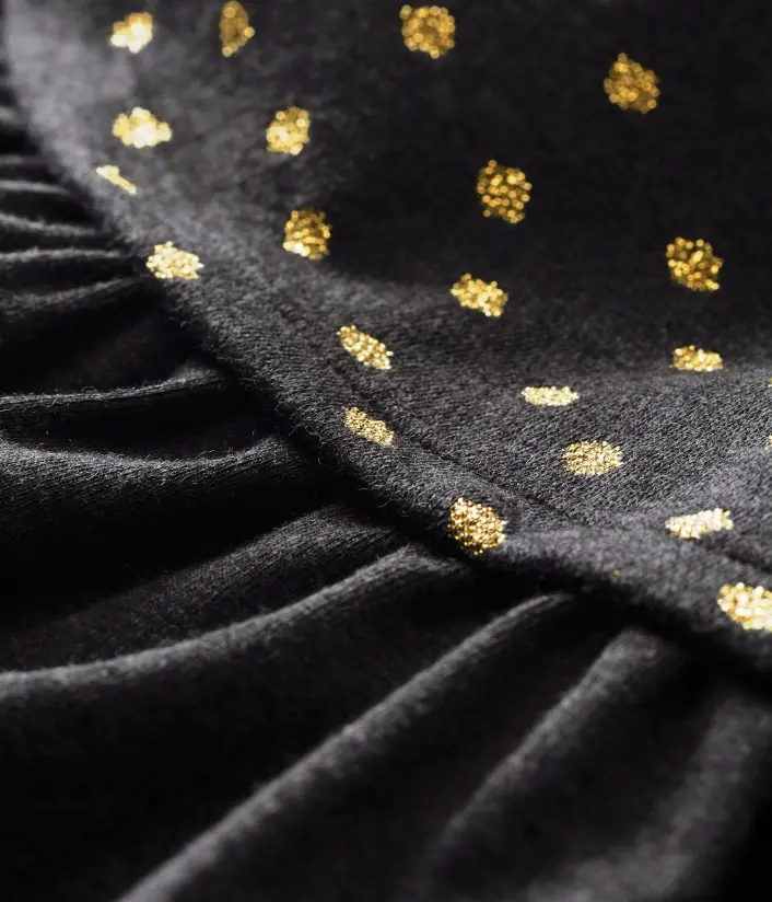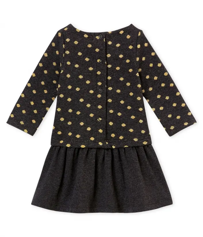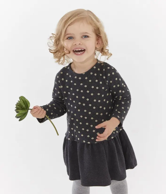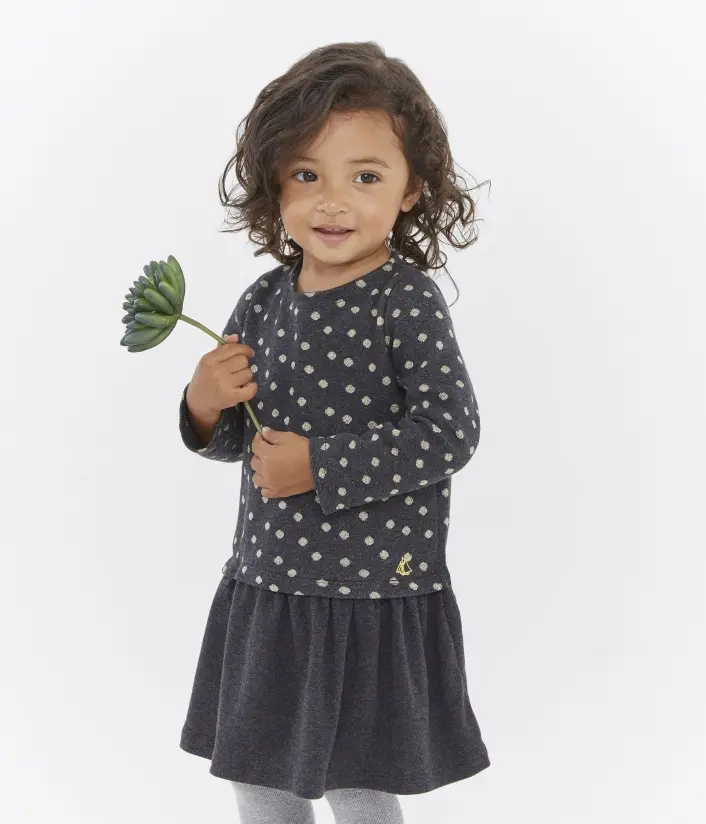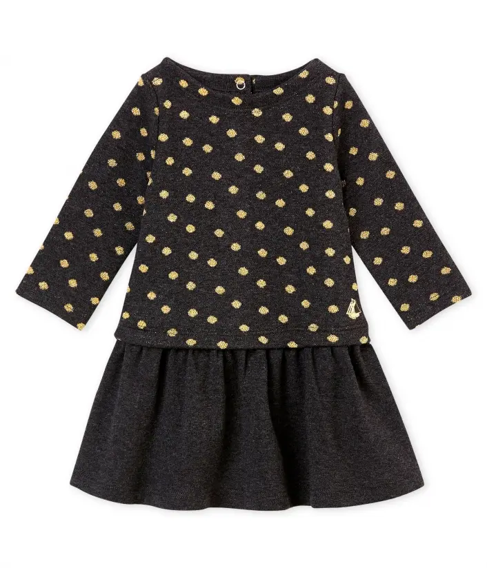 Платье роскошно выглядит за счет особого кроя. Оно с двойной вязкой и с заниженной талией. Украшена трендовым золотистым горошком и логотипом парусника Petit Bateau. Состав 86% хлопок, 7% полиамид, 7% полиэтилен / 100% хлопок