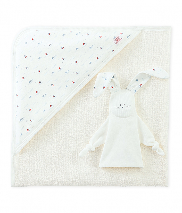Чудесный подарочный набор для купания! Полотенце изготовлено из очень мягкой махровой ткани, которая быстро впитывает воду. Материал: полотенце - 90% хлопок, 10% полиамид; игрушка - 100% хлопок.