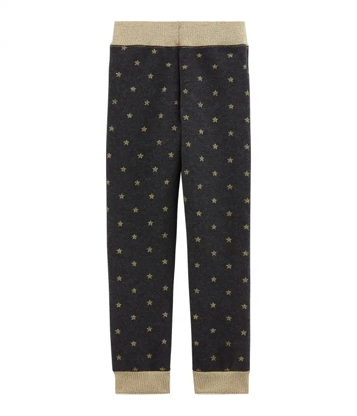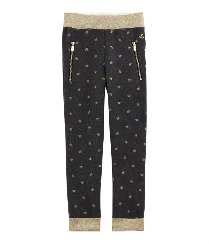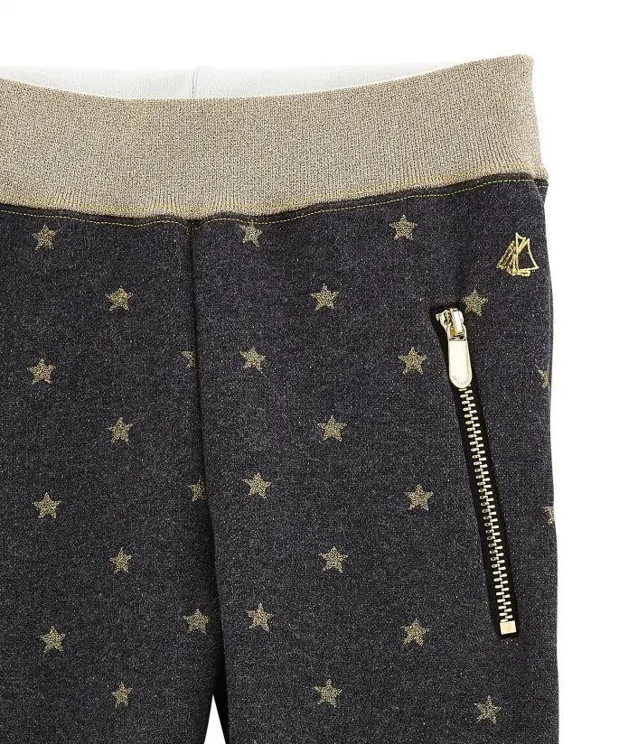 Трикотажные брюки из экстратеплого трикотажа в золотистые звездочки с карманами и застежкой-молнией. Золотистый парусник Petit Bateau является знаковым. Эластичный пояс и манжеты на брюках в золотистом обрамлении выглядят шикарно. Состав: 100% хлопок / 49% хлопок, 31% вискоза, 17% полиэтилен, 3% эластан