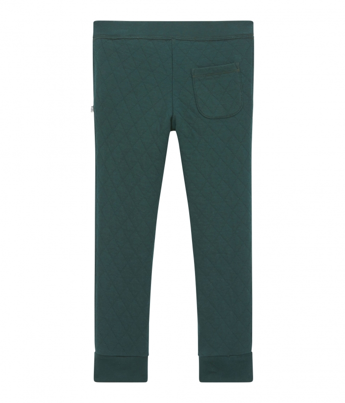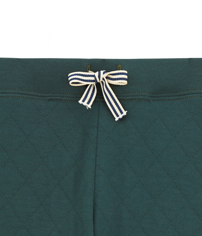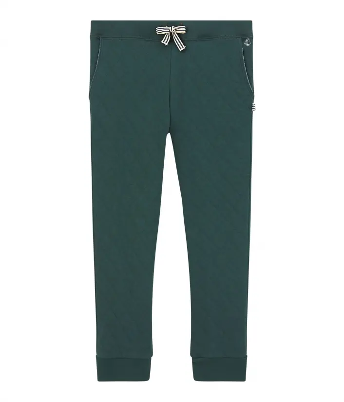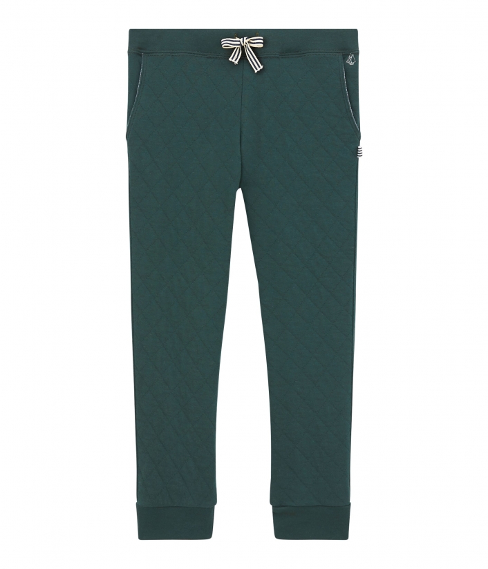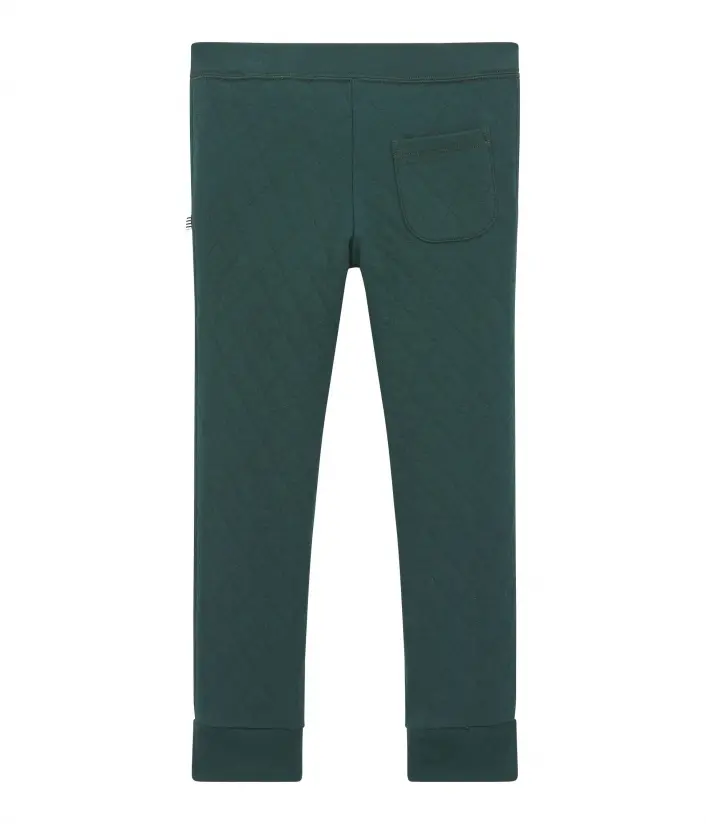 Брюки с двойной трикотажной вязки согреют зимой. Эластичный пояс на полосатой завязке, карманы по бокам и одна сзади, манжеты на брюках. Знаковым является вышивка парусника Petit Bateau. Состав 92% хлопок, 8% полиэстер