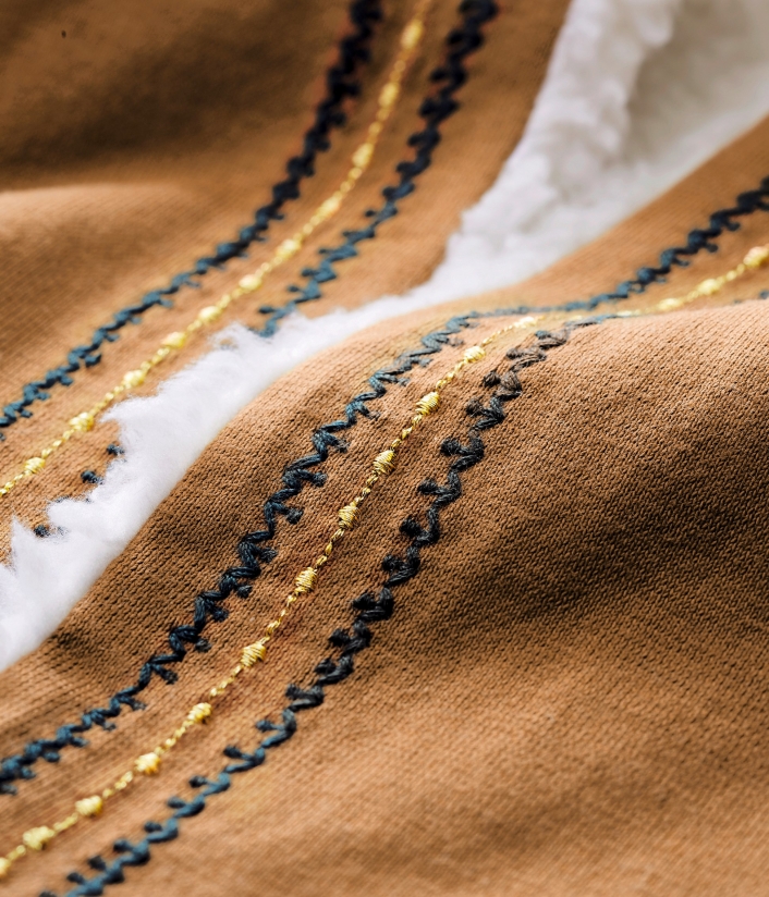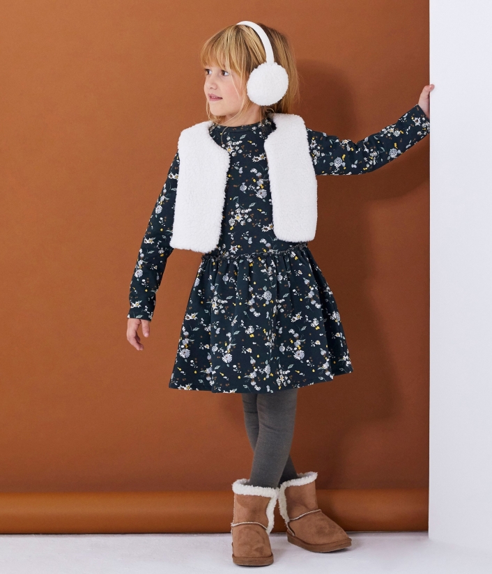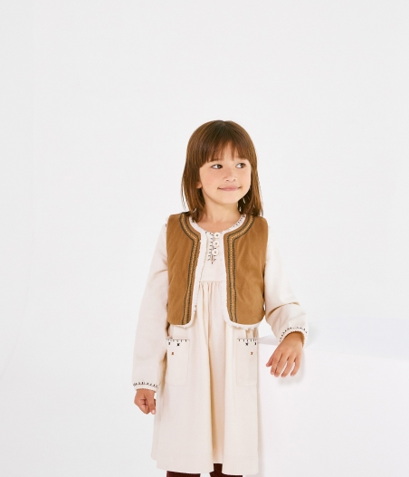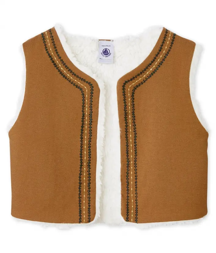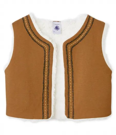 Двусторонняя жилетка для девочки. Она изготовлена ​​из трикотажа и искусственной шерсти. Украшена очаровательной вышивкой. Рекомендуем носить с изысканным платьем или блузкой. Состав: 100% хлопок, 100% полиэстер