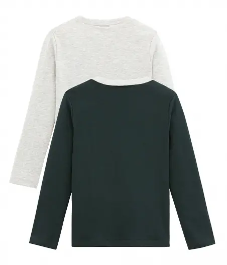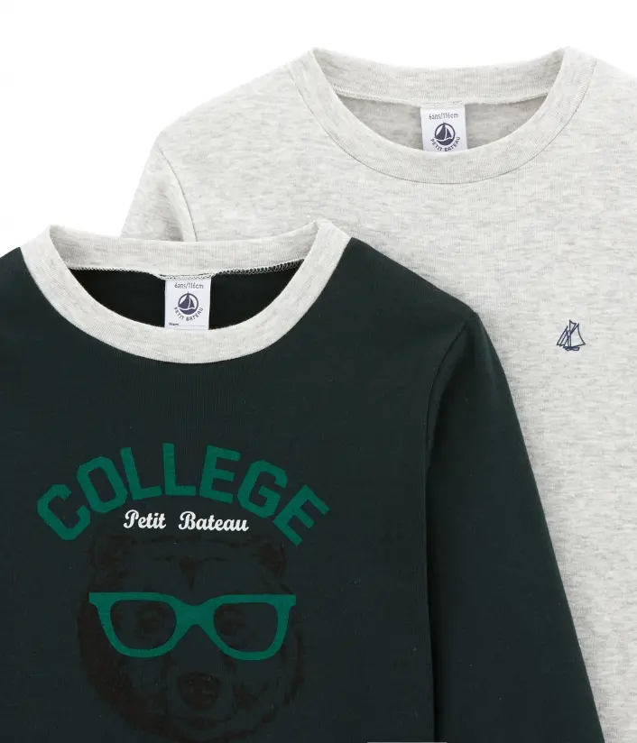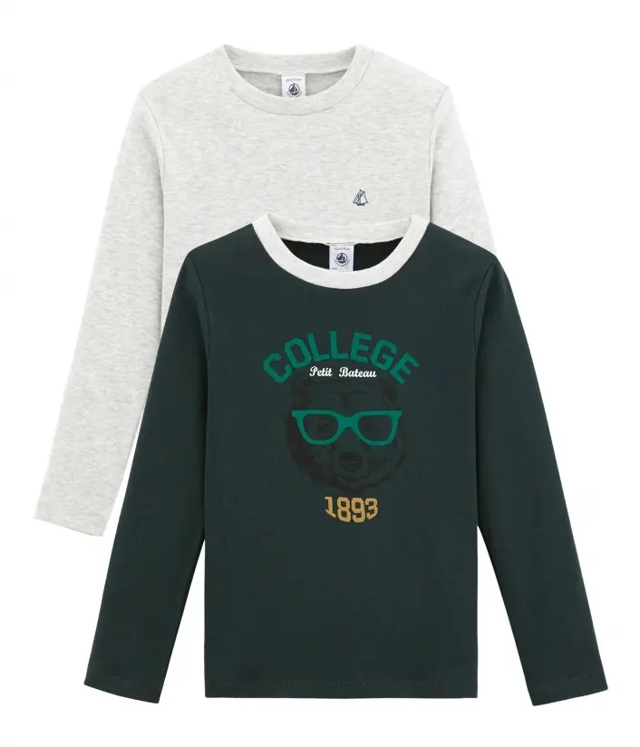В наборе две футболки с длинными рукавами: однотонная с традиционным принтом парусника Petit Bateau, с контрастной горловиной и принтом мордочки мишки в очках, надписью College Petit Bateau 1893 (фр. перевод "колледж Petit Bateau 1893". 1893 - год основания трикотажной фабрики Petit Bateau в городе Труа, Франция). Комбинируйте под одежду. Обязательные в гардеробе мальчика. Состав: 100% хлопок
