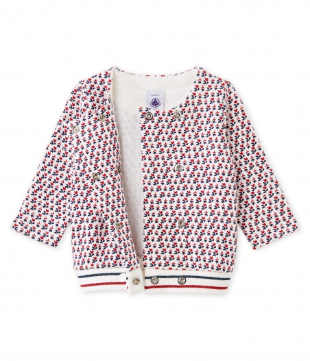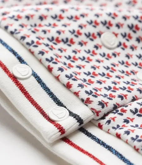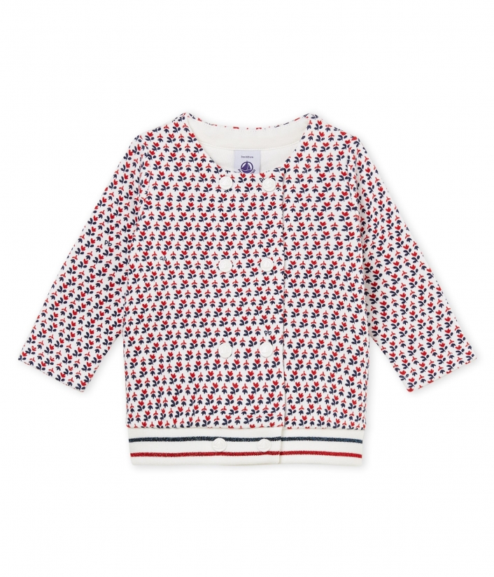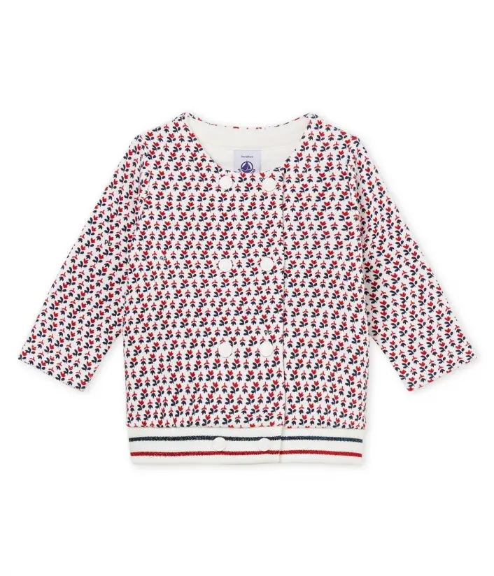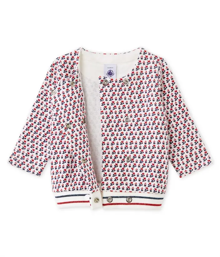 • Кардиган для девочки с цветочным принтом • Округлая форма горловины • Застежка на кнопочки с логотипом бренда Petit Bateau Состав: 100% хлопок / 91% хлопок, 5% фибра, 4% эластан