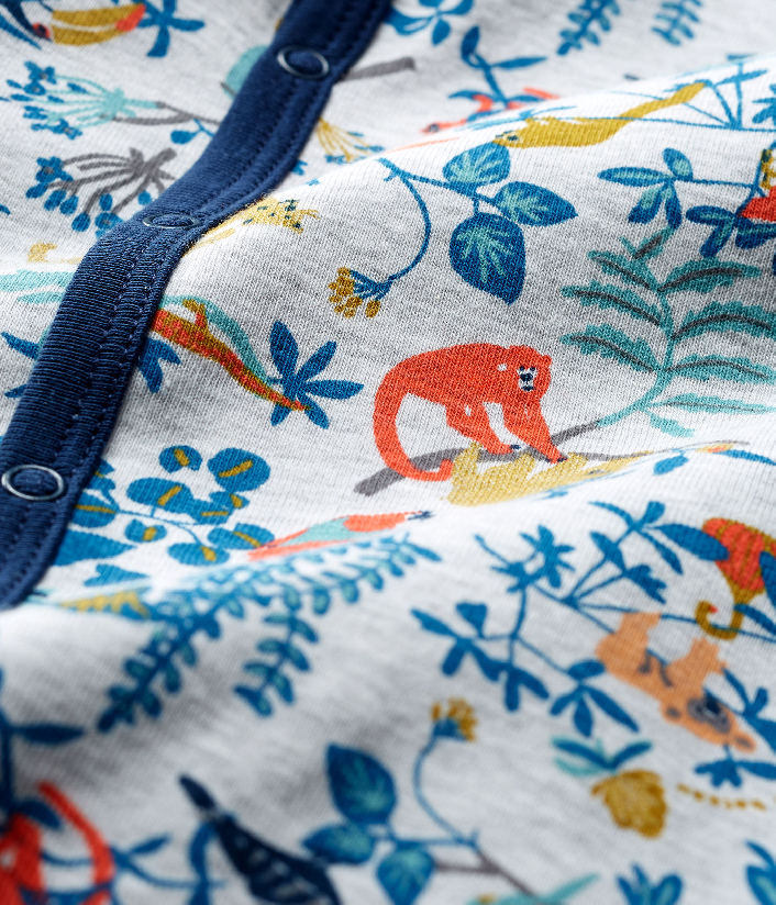 Трикотажная пижама для младенца. Яркий анималистический принт выглядит великолепно. Застежки на кнопочки. Товар сертифицирован OEKO-TEX® Standart 100, что дает уверенность в безопасности и качестве одежды. Состав: 100% хлопок