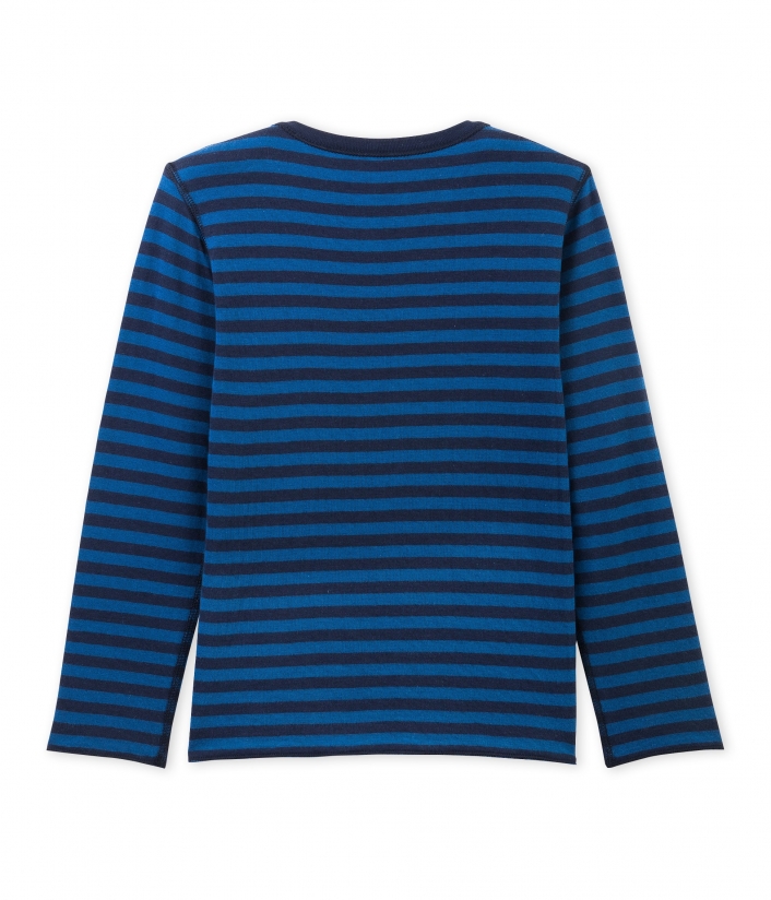 Футболка с длинными рукавами для мальчика. Изготовлена из комбинированного трикотажа в широкую полоску снаружи и мелкую полоску изнутри. Футболка имеет застежку на плече. Вы можете закатать рукава футболки для создания эффектных манжетов. Материал: 100% хлопок.