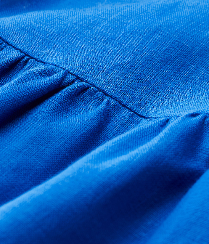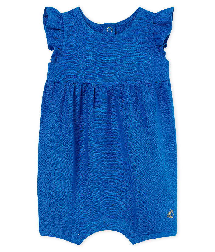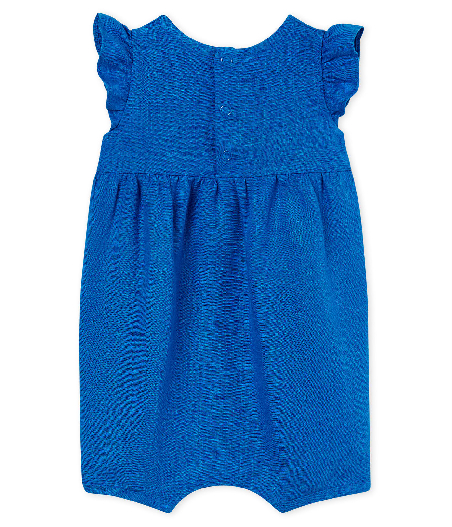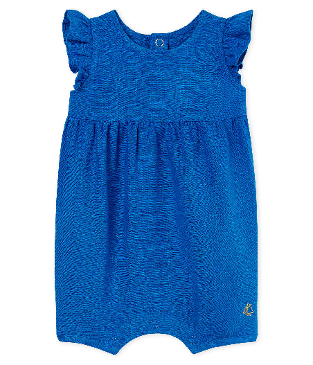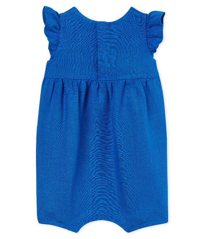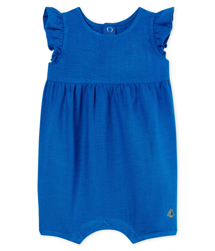 Льняной комбинезон для девочки. Замечательные рюши и рукава-крылышки украшают изделие. Застежки на кнопочки сзади и между ножками. Отличный выбор для приятных летних прогулок. Состав: 100% хлопок