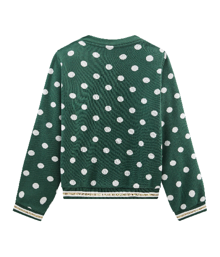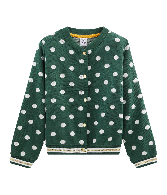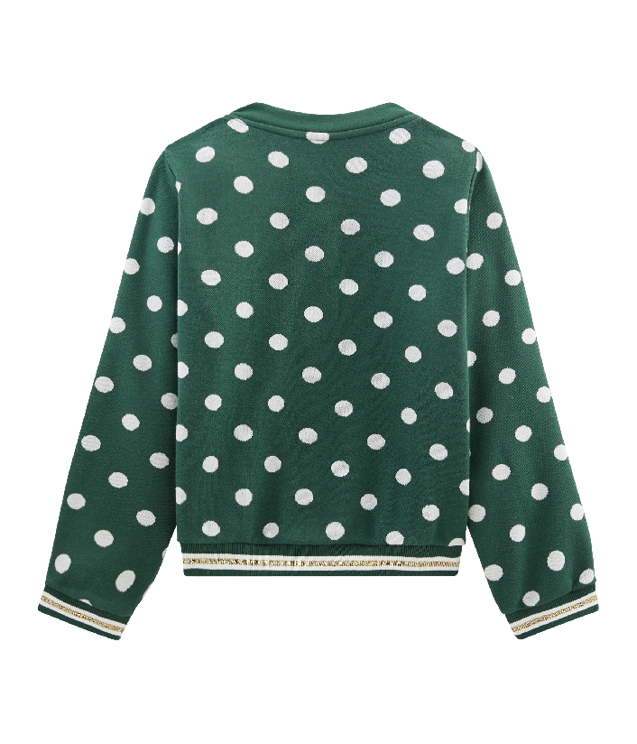 Кардиган из пряжи двойной вязки в горошек. Стиль похож на бейсбольную куртку. Застежка на кнопочки спереди. Состав: 100% хлопок / 89% хлопок, 5% вискоза, 3% полиамид, 3% эластан
