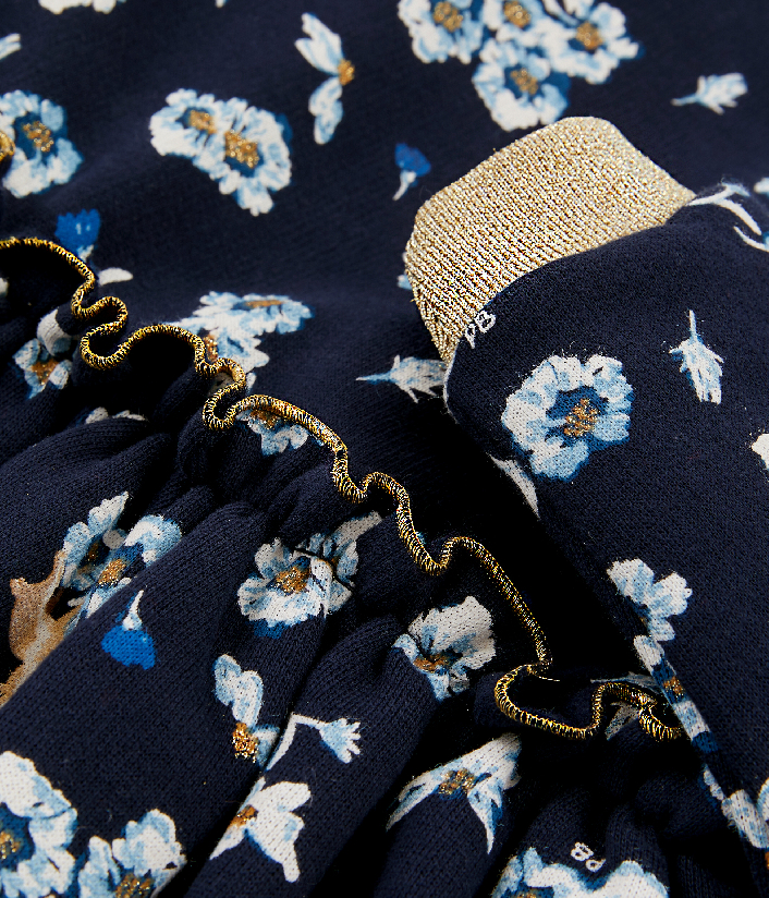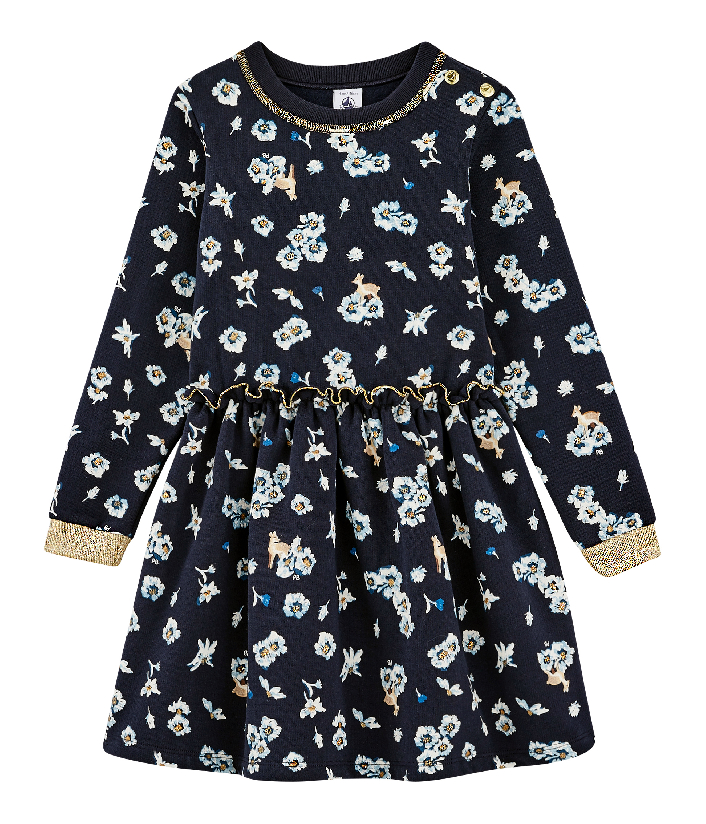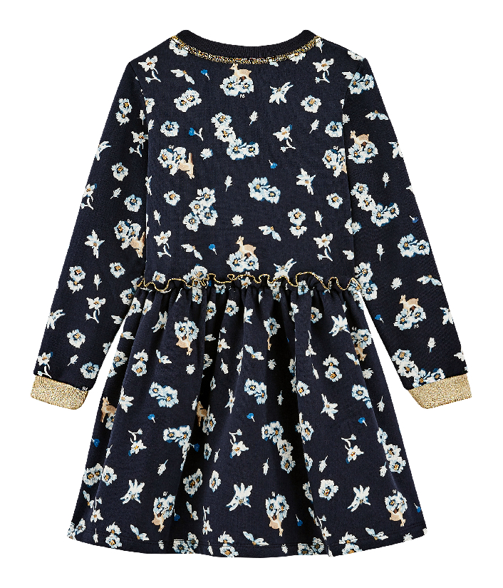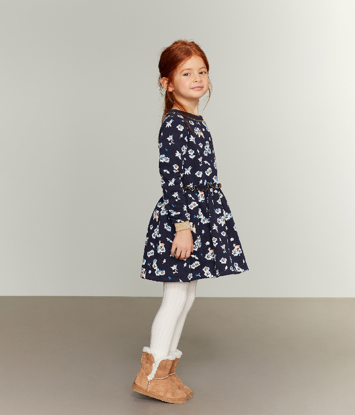 Трикотажное платье с рисунком цветочков и олененка. Контрастная окантовка придает особенный шарм изделию. Пышная юбка не сковывает движений. Ощущайте свободу и комфорт в платье от Petit Bateau. Состав: 100% хлопок/ 49% хлопок, 31% вискоза, 17% полиэстер, 3% эластан