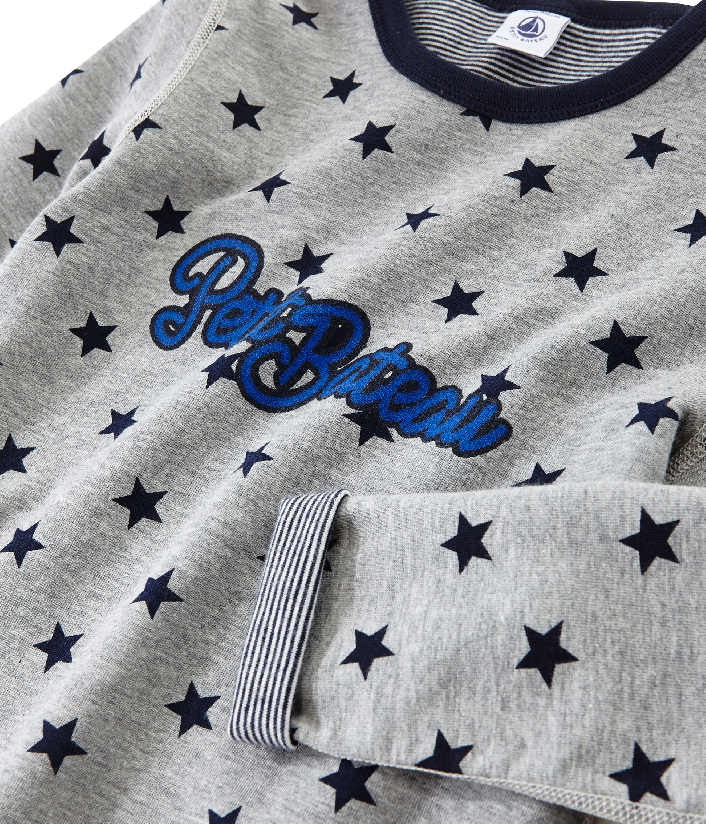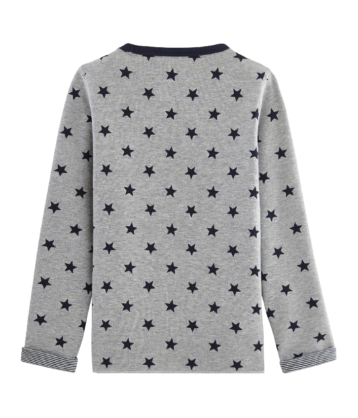 Футболка с длинными рукавами. Спереди декорирована принтом звезд и надписью Petit Bateau. На изнанке украшена в традиционную полоску. Состав: 97% хлопок, 3% полиамид