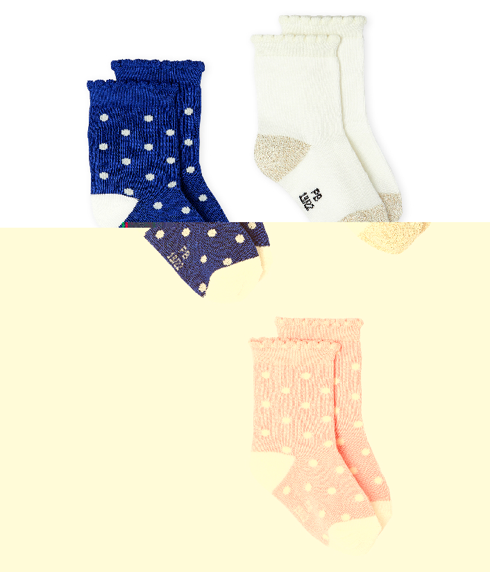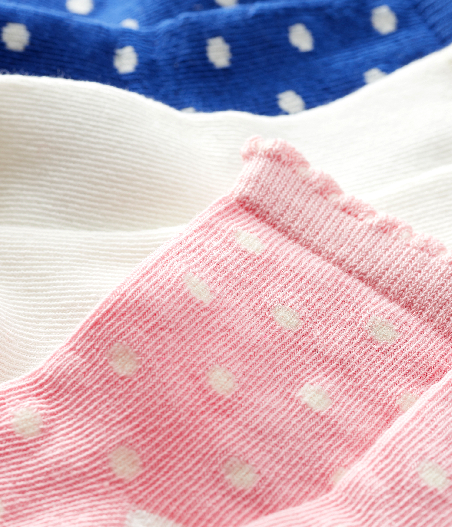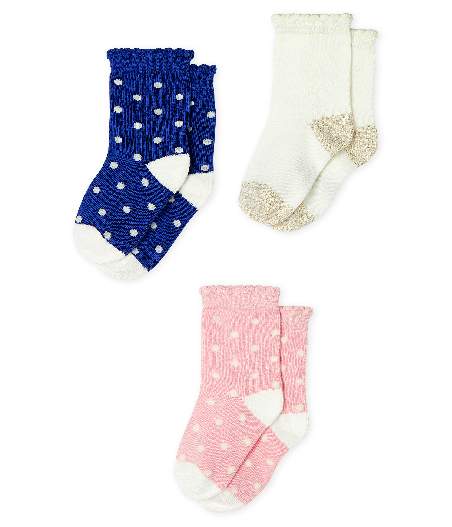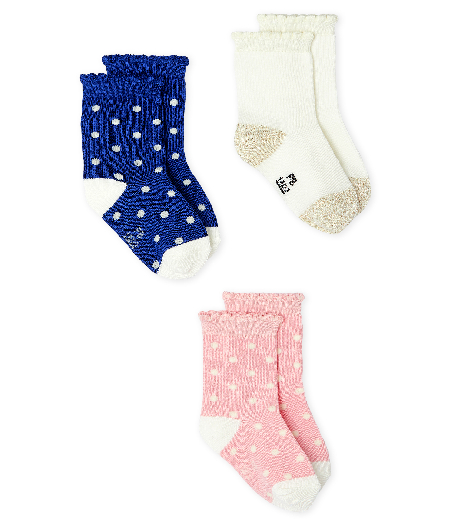 Три пары милых носков. Теплые и комфортные, сохранят в тепле ножки малыша. Длина ступни: 15/18 = 7,4-8,3 см; 19/22 = 9,7-10,6 см; 23/26 = 18,8-14,6 см. Состав: 72% хлопок, 22% полиэстер,   3% эластан, 2% полиамид, 1% фибра