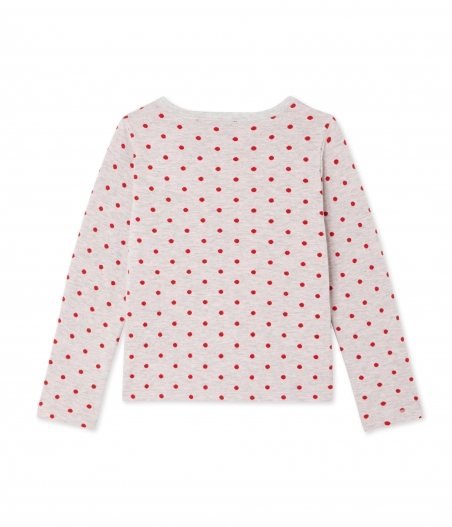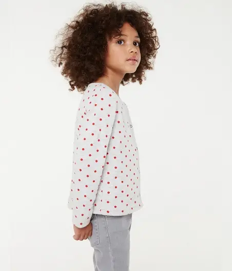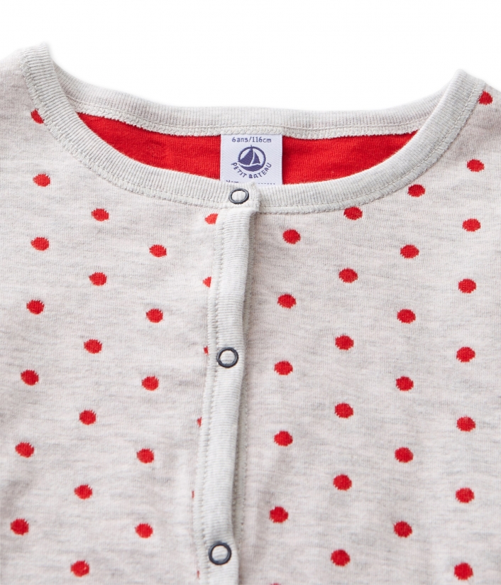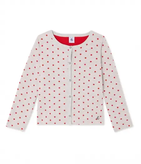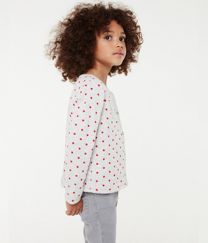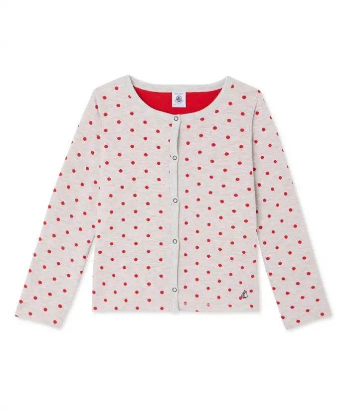 Кардиган для девочки, изготовленный из двухслойной ткани: однотонной внутри, снаружи - в горошек. Кардиган имеет застежку на кнопки. Красивая и практичная вещь для создания модного образа. Материал: 100% хлопок.