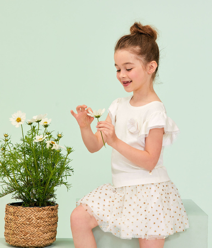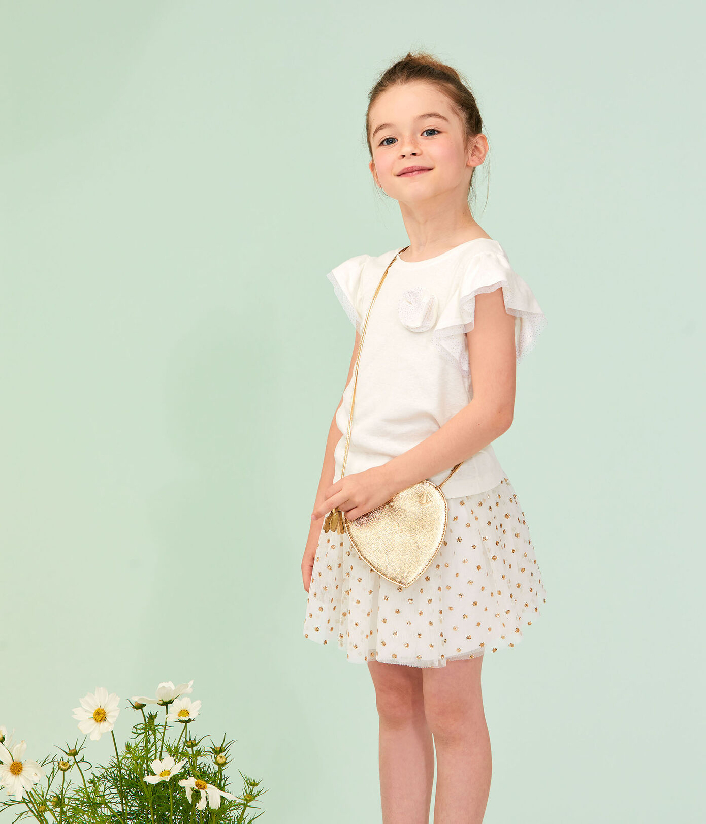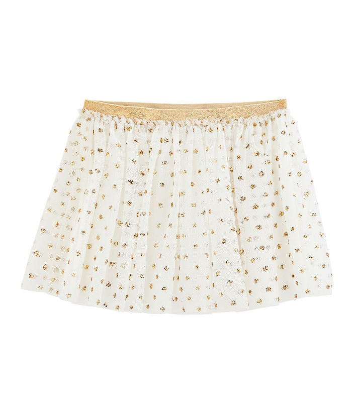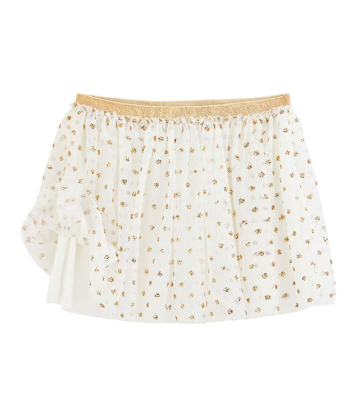 Пышная юбка украшена золотистым горошком. Она выглядит очаровательно. Будьте в тренде с Petit Bateau. Состав: 100% полиэстер / 100% хлопок