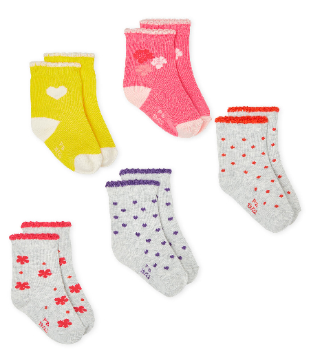 Пять пар милых носков для детей прекрасно завершат образ. Длина ступни: 15/18 = 7,4-8,3 см; 19/22 = 9,7-10,6 см; 23/26 = 18,8-14,6 см.Состав: 75% хлопок, 23% полиамид, 2% эластан