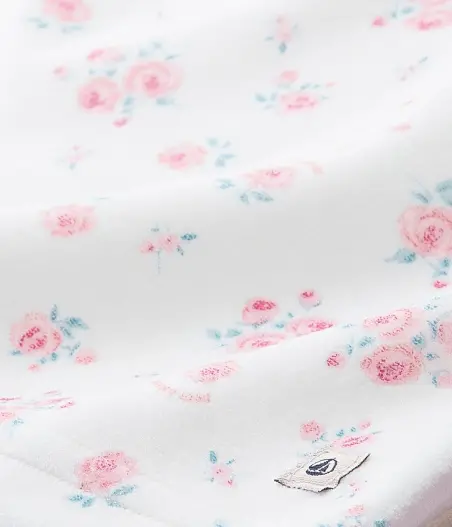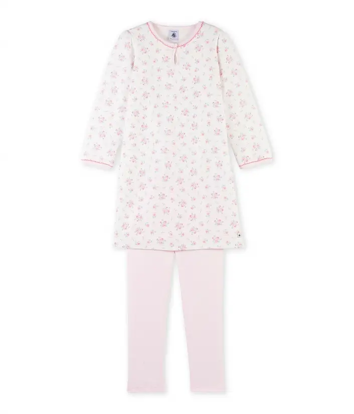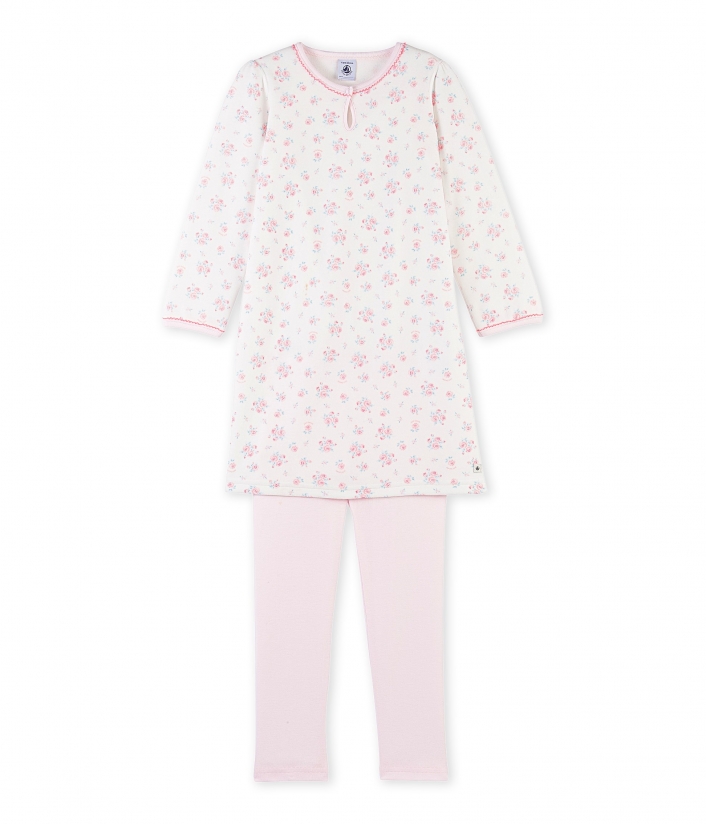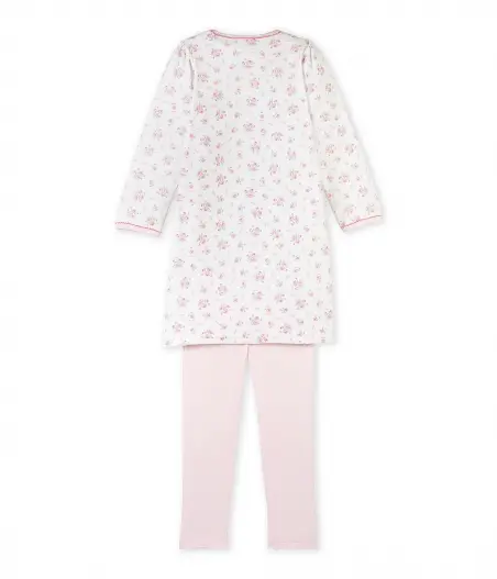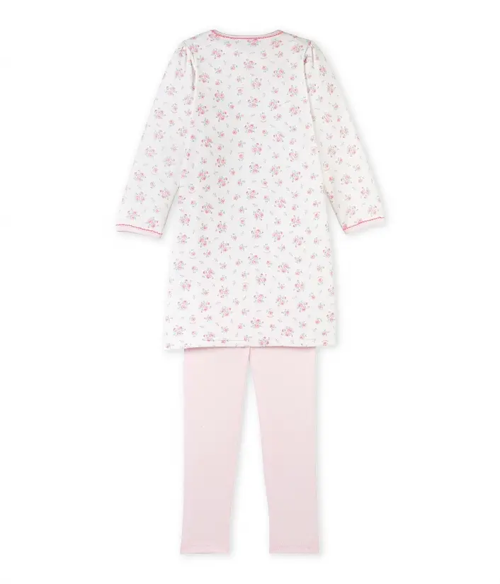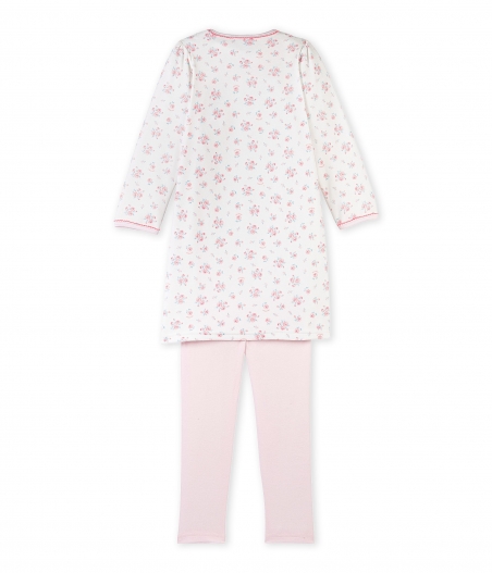 Велюровая пижама для девочки, состоящая из платья с длинными рукавами и легинсов. Платье изготовлено из ткани с чудесным цветочным принтом, вырез и манжеты имеют элегантную отделку в стиле "пико". Материал: 75% хлопок, 25% полиэстер / 100% хлопок.