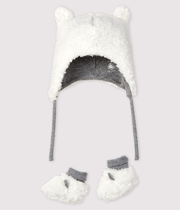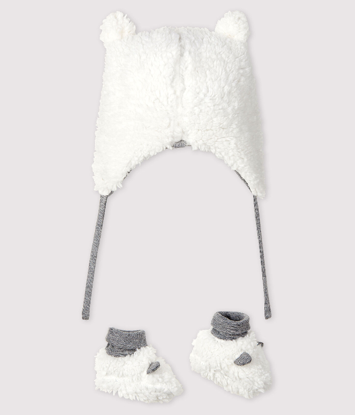 Шапочка на завязке и пинетки украшены милыми ушками. Изделия созданы снаружи из искусственного меха, а изнутри - натурального хлопка. Сертифицированный материал Oeko-Tex Standart 100 гарантирует качество. Состав: 100% полиэстер / 100% хлопок