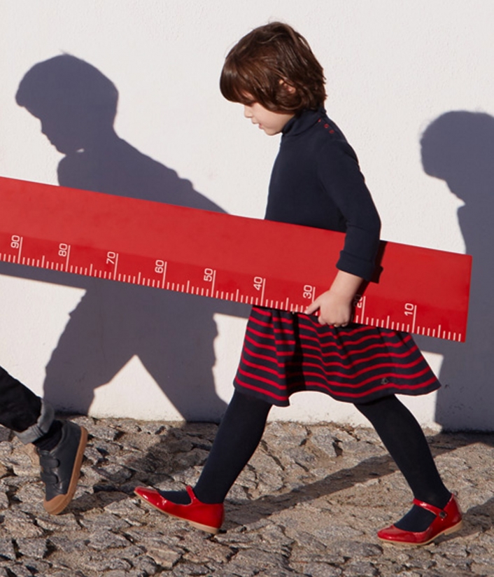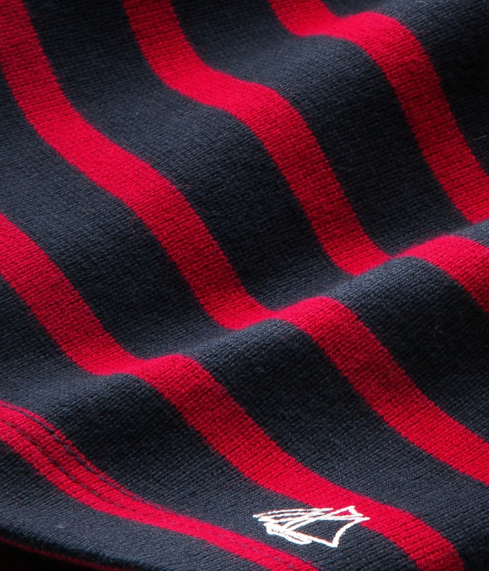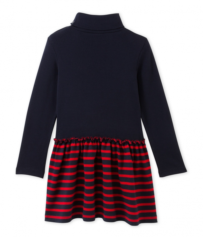 Платье с высоким горлом и длинными рукавами, изготовленное из комбинированной ткани: однотонный верх, юбка в полоску. Платье имеет застежки на плече, декорировано сборками на юбке. Материал: 100% хлопок.