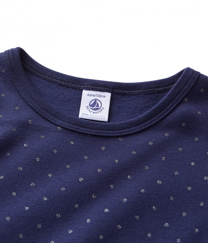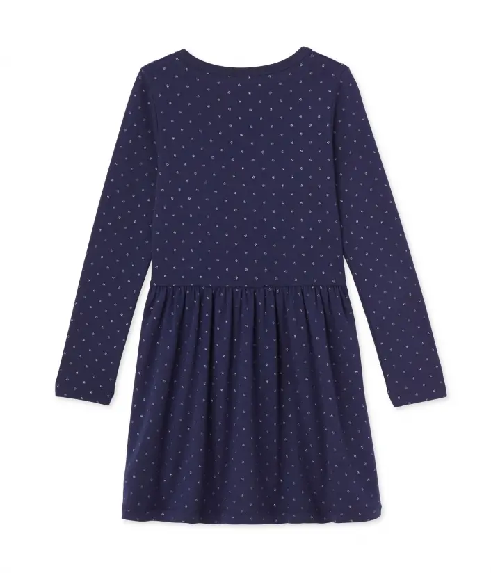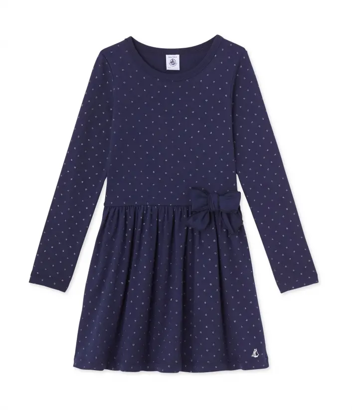 Платье с круглым вырезом и длинными рукавами, изготовленное из хлопковой ткани в мелкий серебристый горошек. Платье украшено красивым бантом на талии. Материал: 100% хлопок.