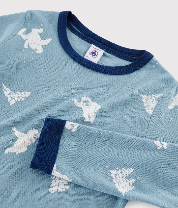 Интересный принт Йети украшает футболку с длинными рукавами. Брюки однотонные. Состав: 100% хлопок