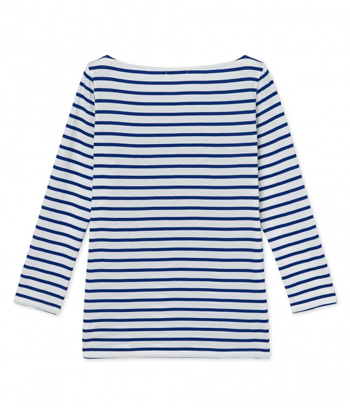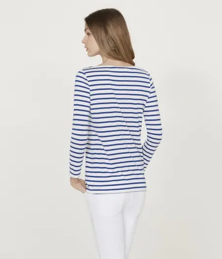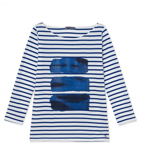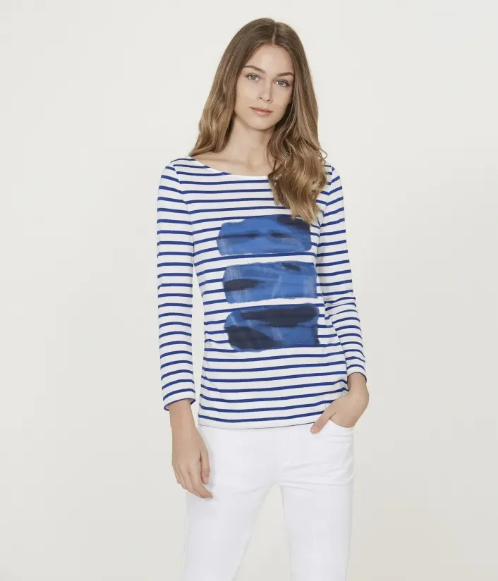 Женская футболка с рукавами 7/8, изготовленная из очень легкого трикотажа в полоску и украшенная эксклюзивным рисунком. Дизайн футболки был создан Satu Maaranen, победителем фестиваля моды в Ере. Материал: 100% хлопок.