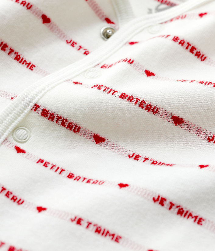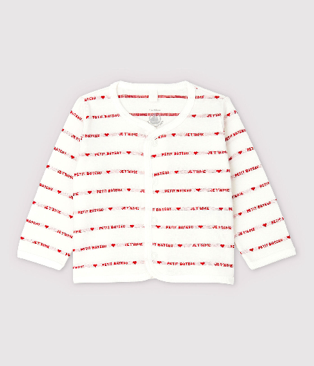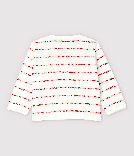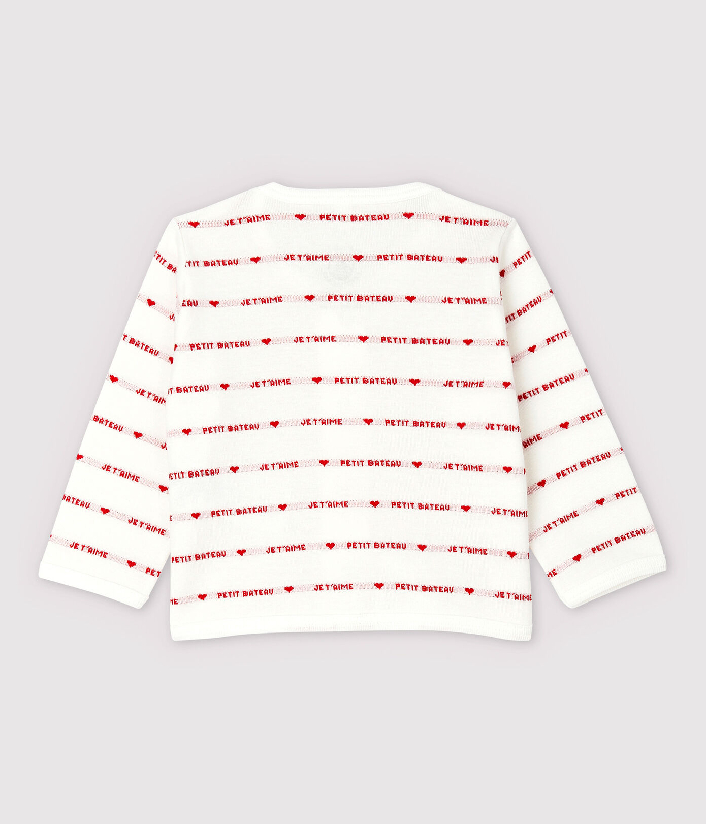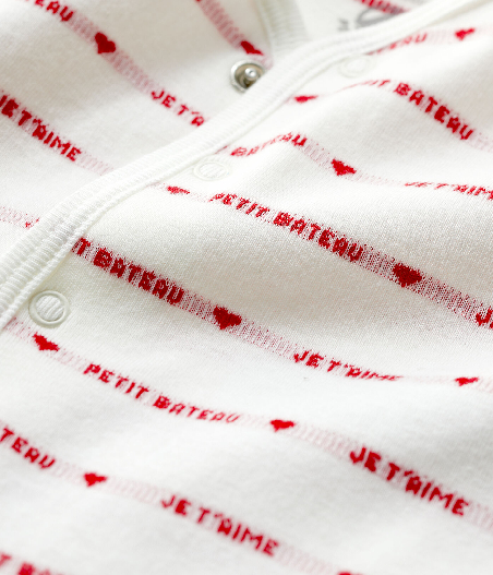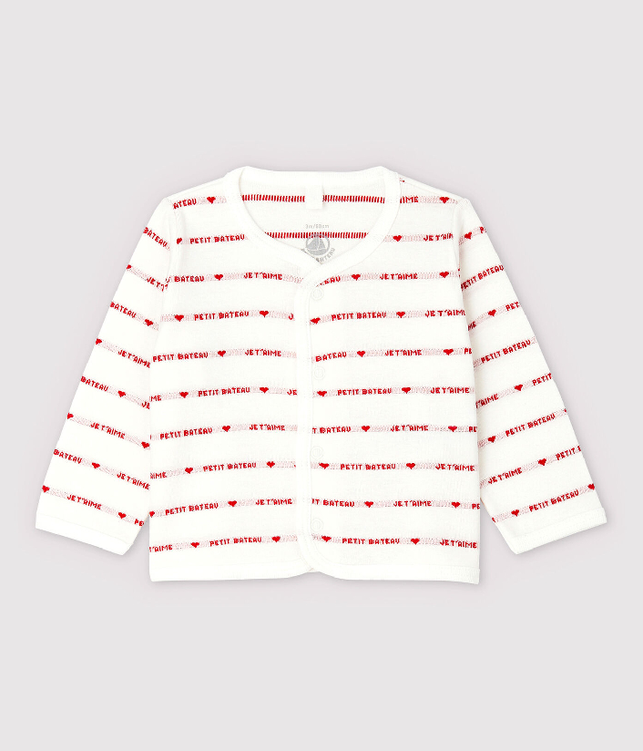 Кардиган для девочки с надписью Je t'aime (в переводе с французского означает "Я тебя люблю"). Застежка на кнопочки. Органическая хлопчатобумажная ткань Petit Bateau отмечена этикеткой OEKO-TEX®. Состав: 100% хлопок
