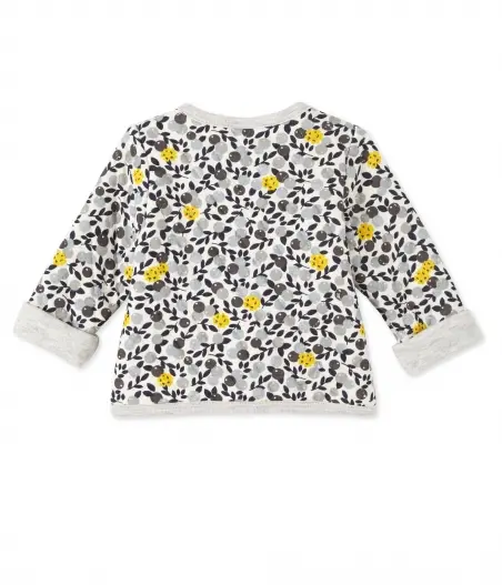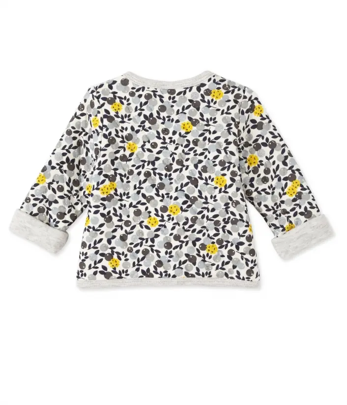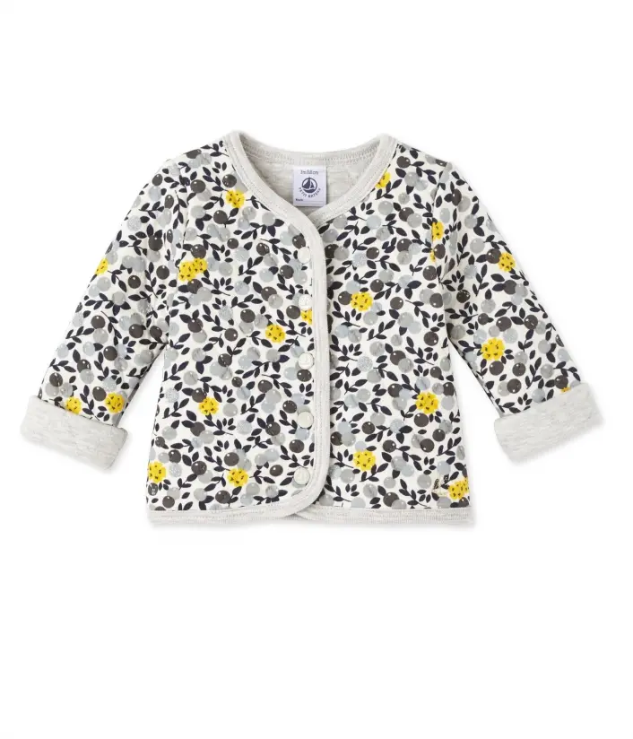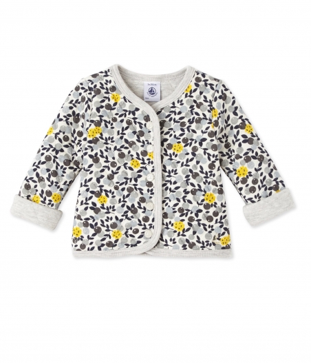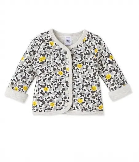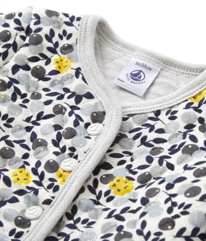 Кардиган для девочки, изготовленный из двухслойной ткани: однотонной внутри, снаружи - с чудесным растительным узором. Кардиган имеет застежку на кнопки с изображением логотипа Petit Bateau. Материал: 75% хлопок, 25% полиэстер.