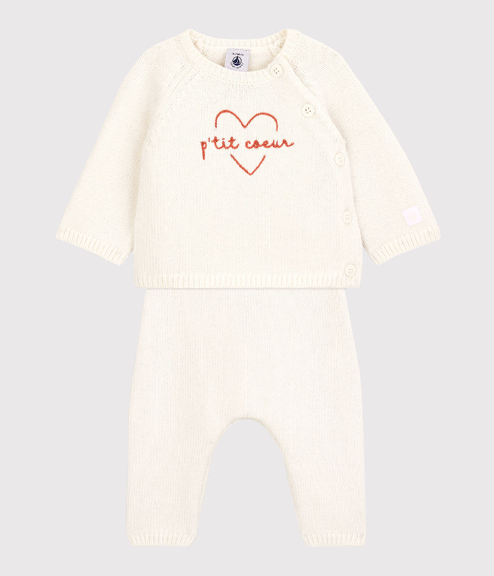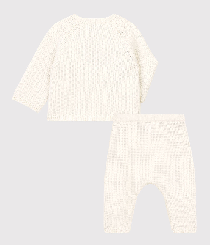 Кардиган и брюки из пряжи шерсти и хлопка. Кардиган с застежкой на пуговицы. Брюки с эластичным поясом. Замечательный подарок для новорожденного. Состав: 55% шерсть, 45% хлопок