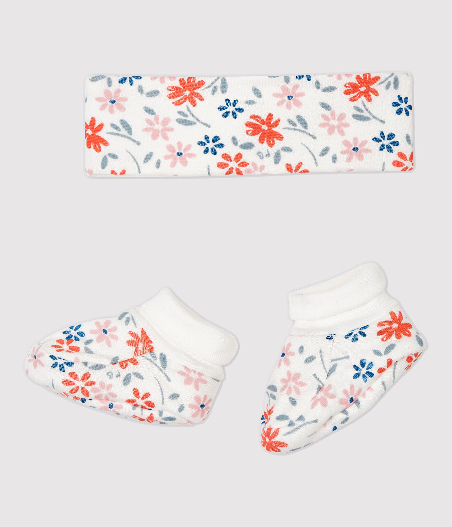Эластичная повязка для волос и пинетки украшены цветочным принтом. Состав: 100% хлопок