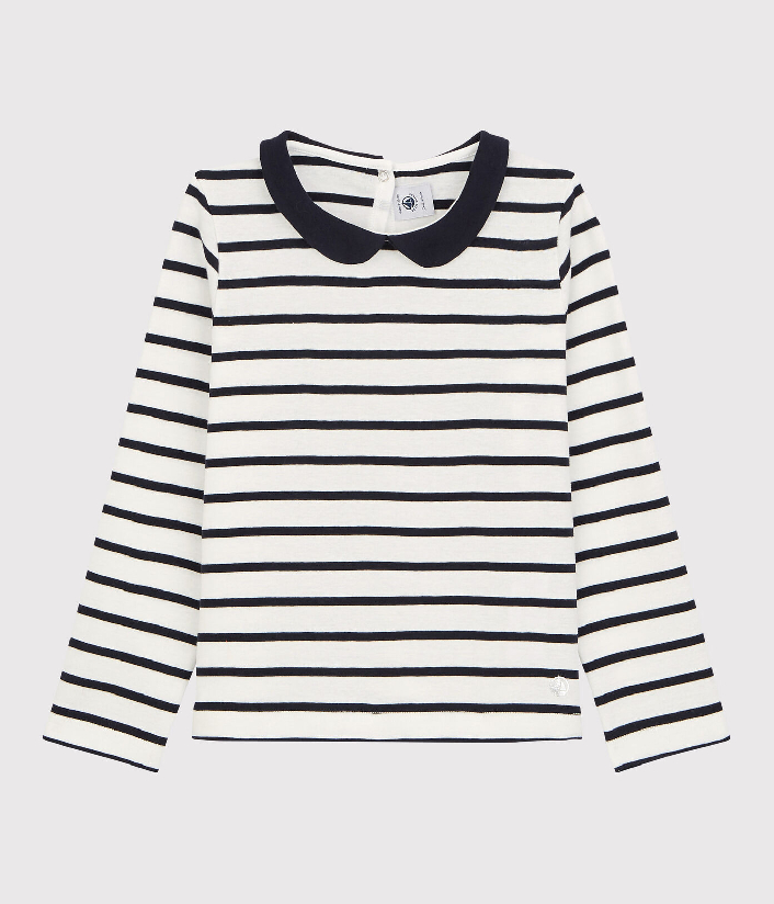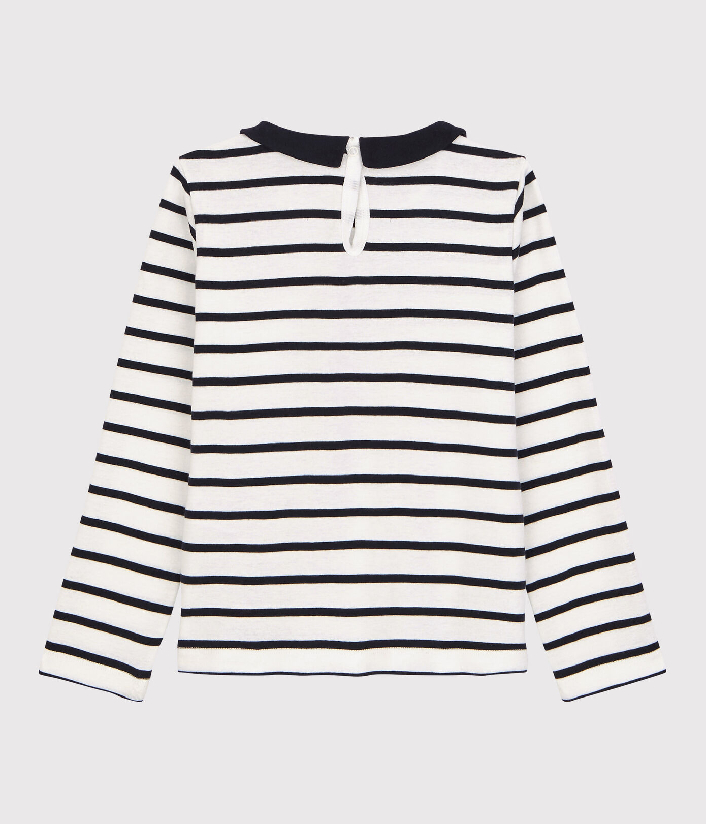 Футболка с длинными рукавами украшена полоской и воротником в стиле "Питер Пэн". Застежка на кнопочку сзади. Состав: 100% хлопок