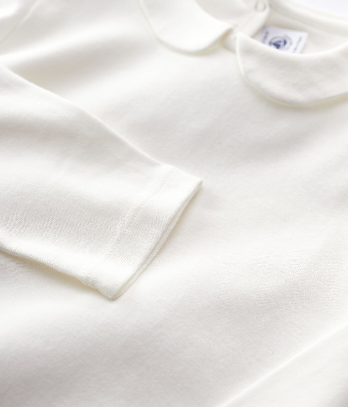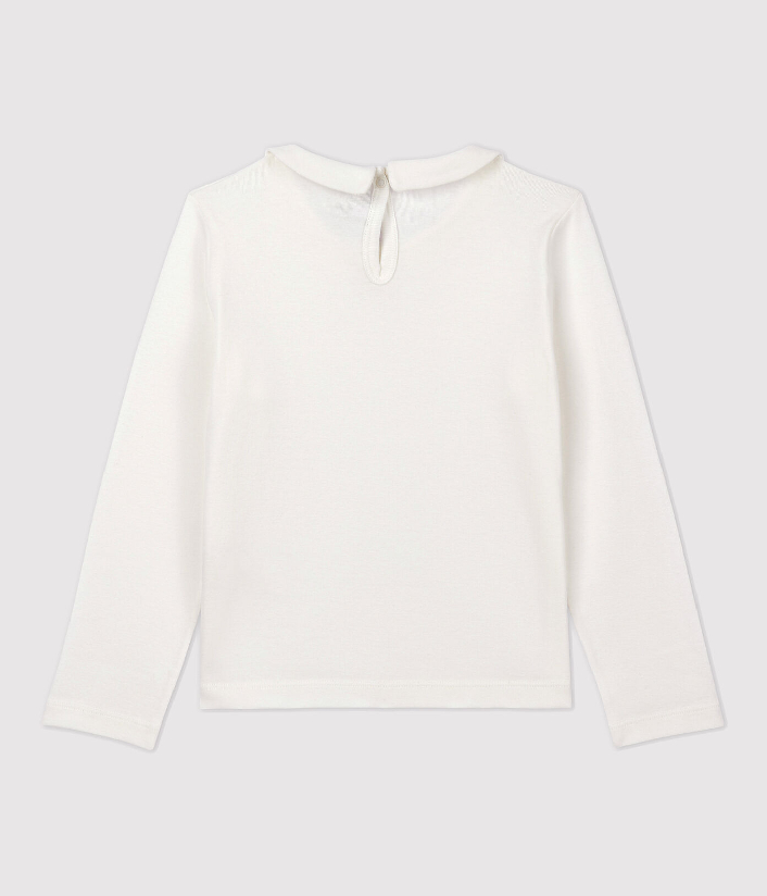Белая футболка с длинными рукавами украшена воротником. Застежка на кнопочку сзади. Состав: 100% хлопок