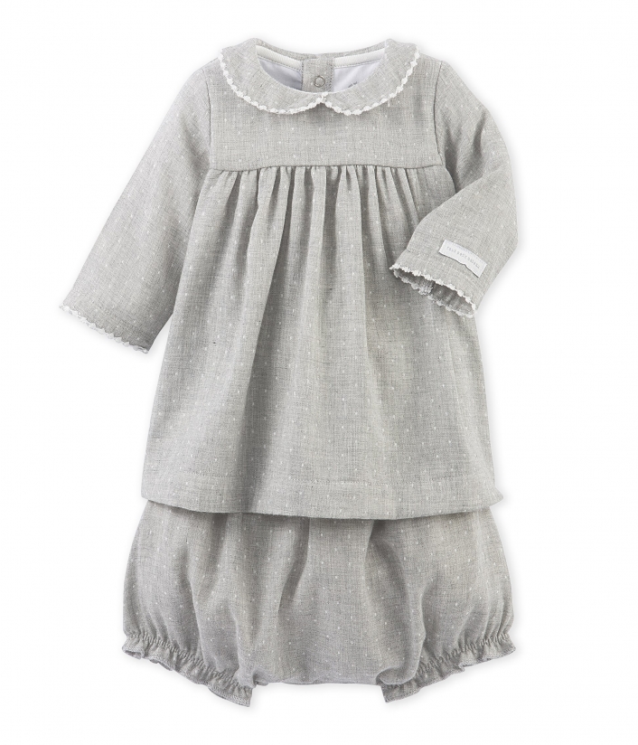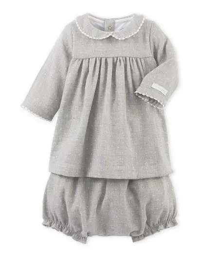 Детское платье с длинными рукавами, изготовленное из жаккардовой ткани. Воротничок и манжеты декорированы кружевом. В комплекте с этим прекрасным платьем идут панталоны с резинкой на ножках. Материал: 100% хлопок.