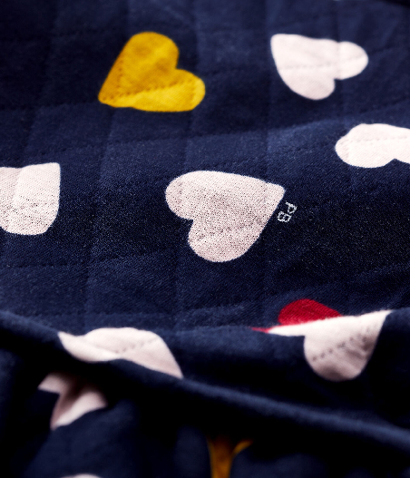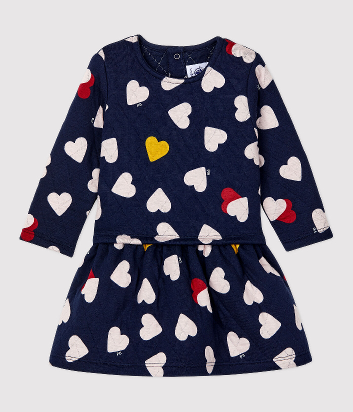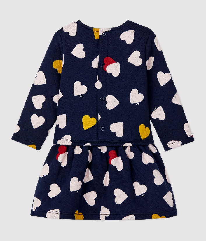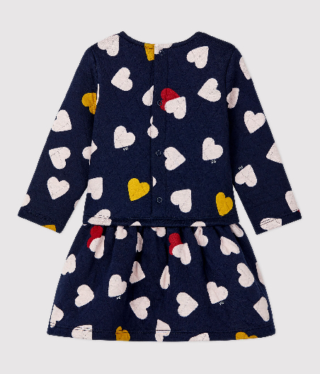 Теплое трикотажное платье с длинными рукавами украшено сердечками. Застежка на кнопочки сзади. Состав: 75% хлопок, 25% полиэстер