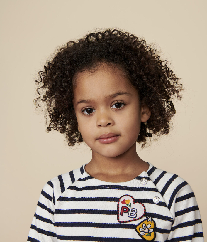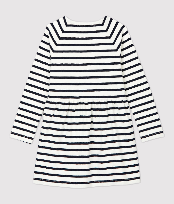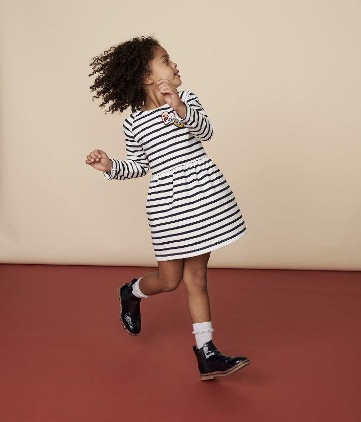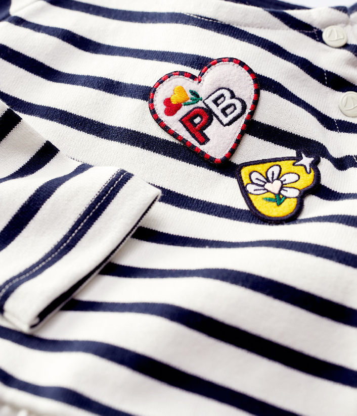 Трикотажное платье украшено полоской и креативной нашивкой в ​​форме сердечек. Застежка на кнопочки. Состав: 100% хлопок