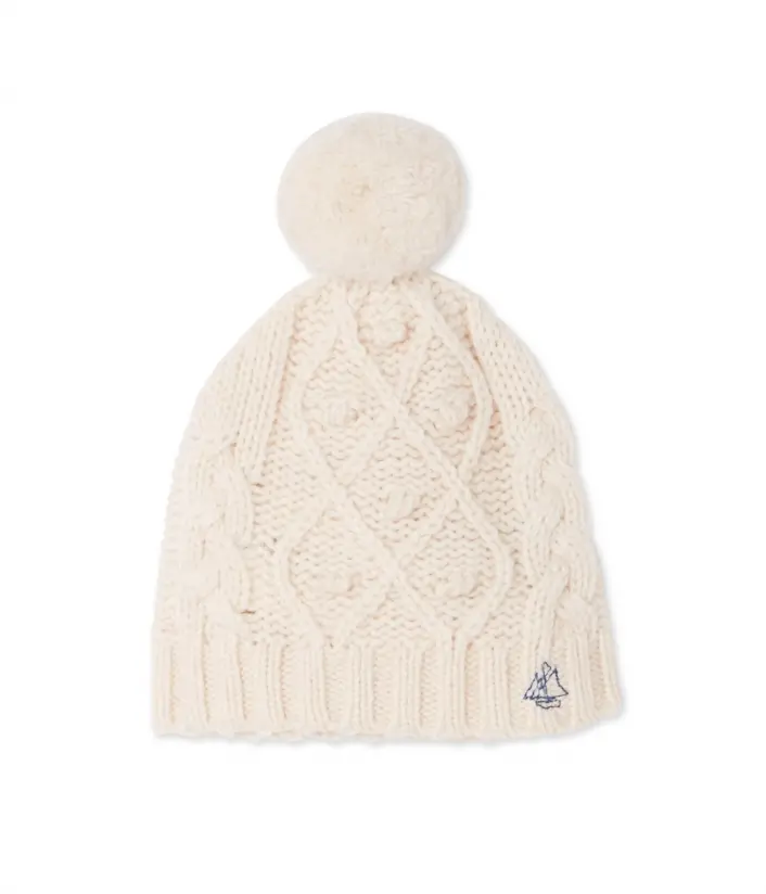 Шерстяная шапка с красивым узором для девочки, украшена большим помпоном. Материал: 62% шерсть, 38% полиамид.