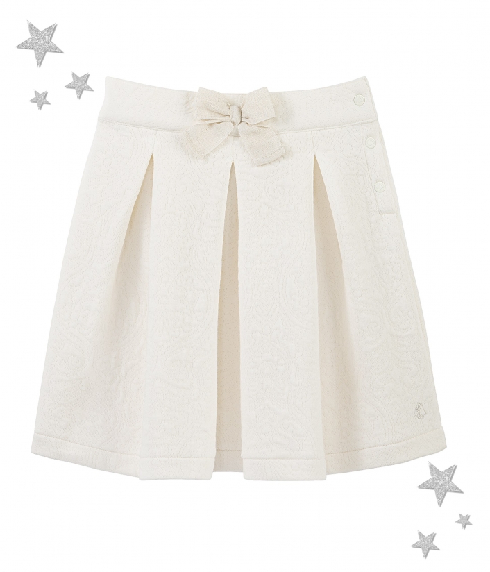 Очень красивая жаккардовая юбка для девочки, украшенная чудесным бантиком на талии и глубокими складками. Юбка имеет застежку на кнопки сбоку. Эта элегантная юбка идеально подойдет для праздников. Материал: 85% хлопок, 15% полиэстер.