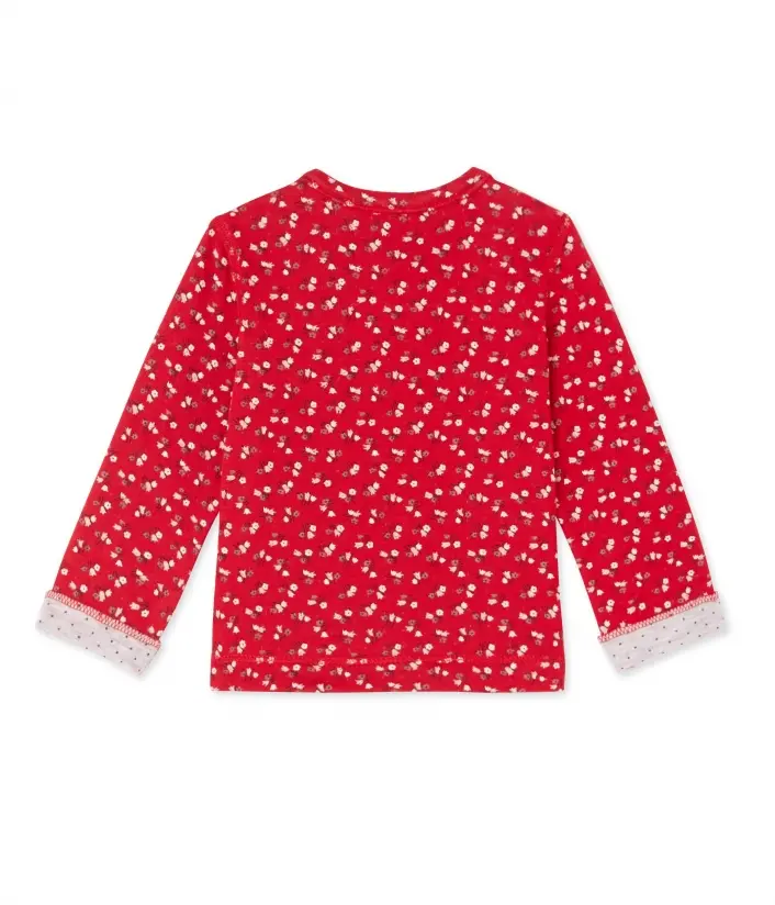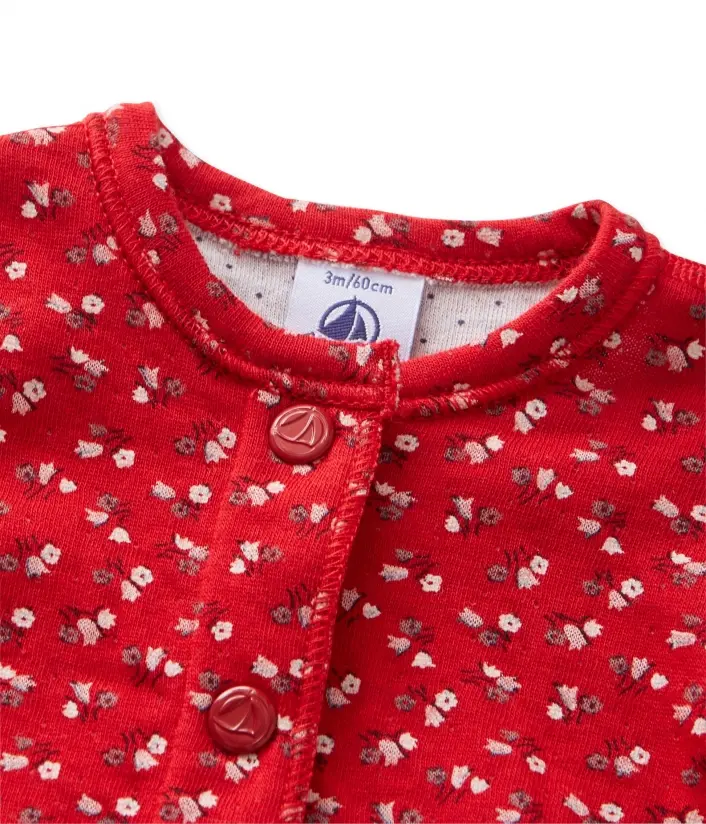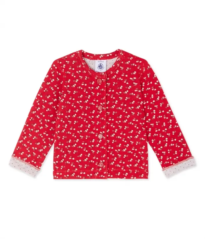 Кардиган для девочки, изготовленный из двуслойной ткани, с цветочным узором снаружи и принтом в мелкий горошек изнутри. Кардиган имеет застежку на кнопки. Материал: 100% хлопок.