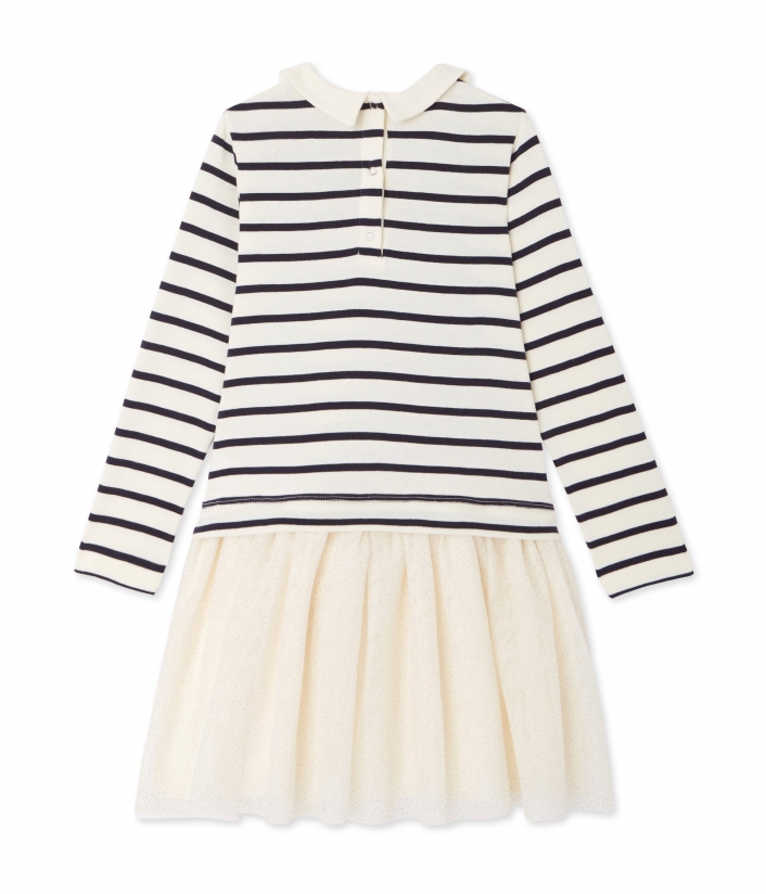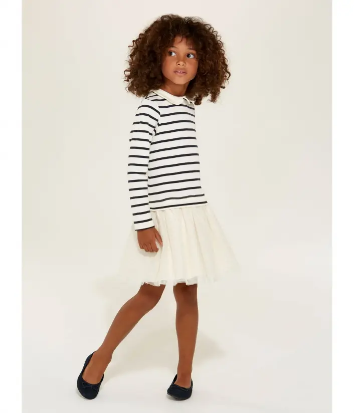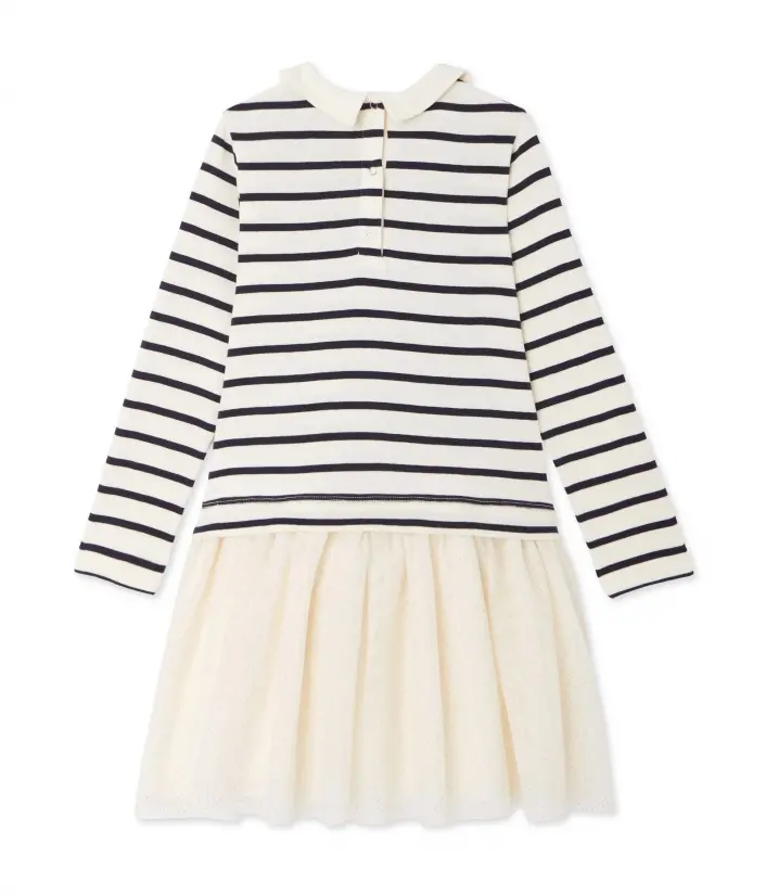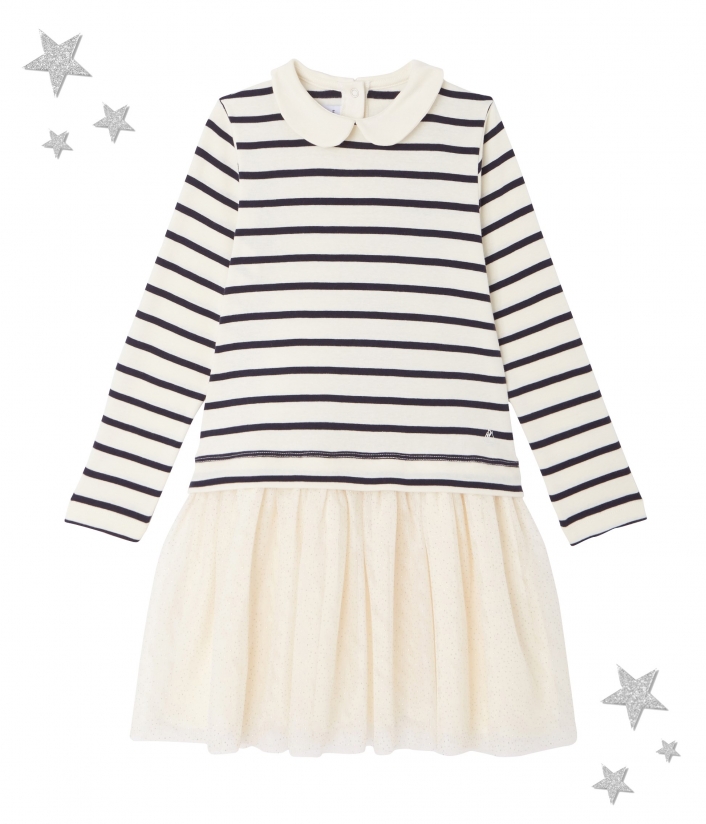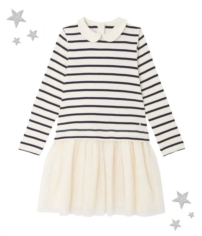 Красивое праздничное платье с длинными рукавами, декорированное юбкой из фатина с блестками. Верх платья изготовлен из трикотажа в полоску. Платье оснащено застежкой на кнопки на спине и воротником в стиле "Питер Пэн". Чудесный выбор для вечеринки! Матери