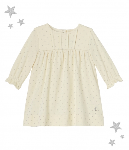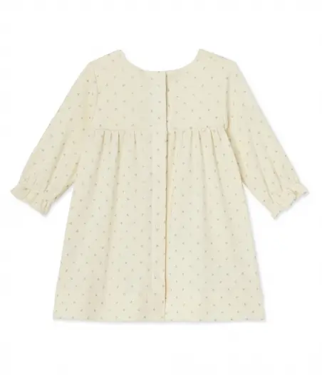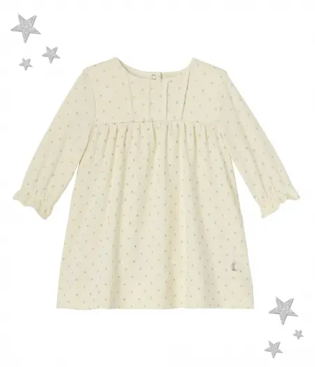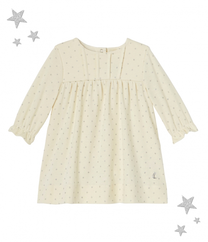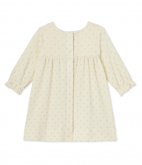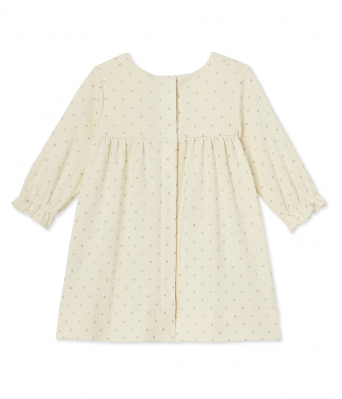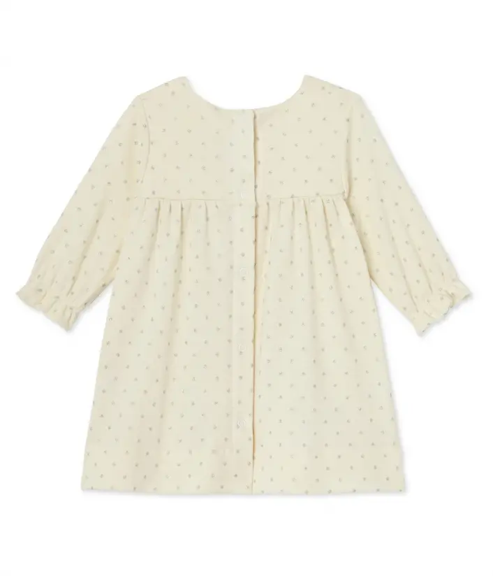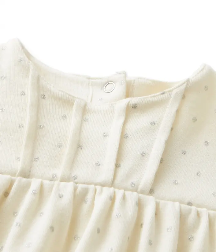 Платье с длинными рукавами, в мелкий серебристый горошек. Вам непременно понравятся красивые детали платья: бантовые складки на юбке, удобные застежки, отделка на манжетах и вырезе. Это платье прекрасно подойдет для создания праздничного образа. Материал: 100% хлопок.