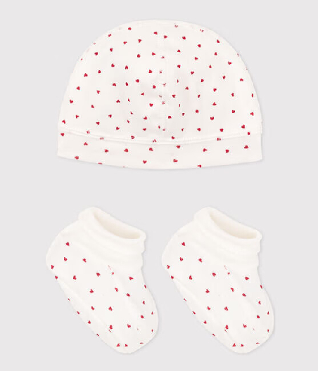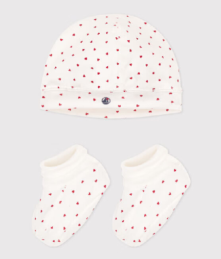 Шапочка украшена сердечками и логотипом Petit Bateau. Трикотажные пинетки обеспечат комфорт хрупким ножкам младенца. Сертифицированный материал Oeko-Tex Standart 100 гарантирует качество. Идеальный выбор для подарка. Состав: 100% хлопок